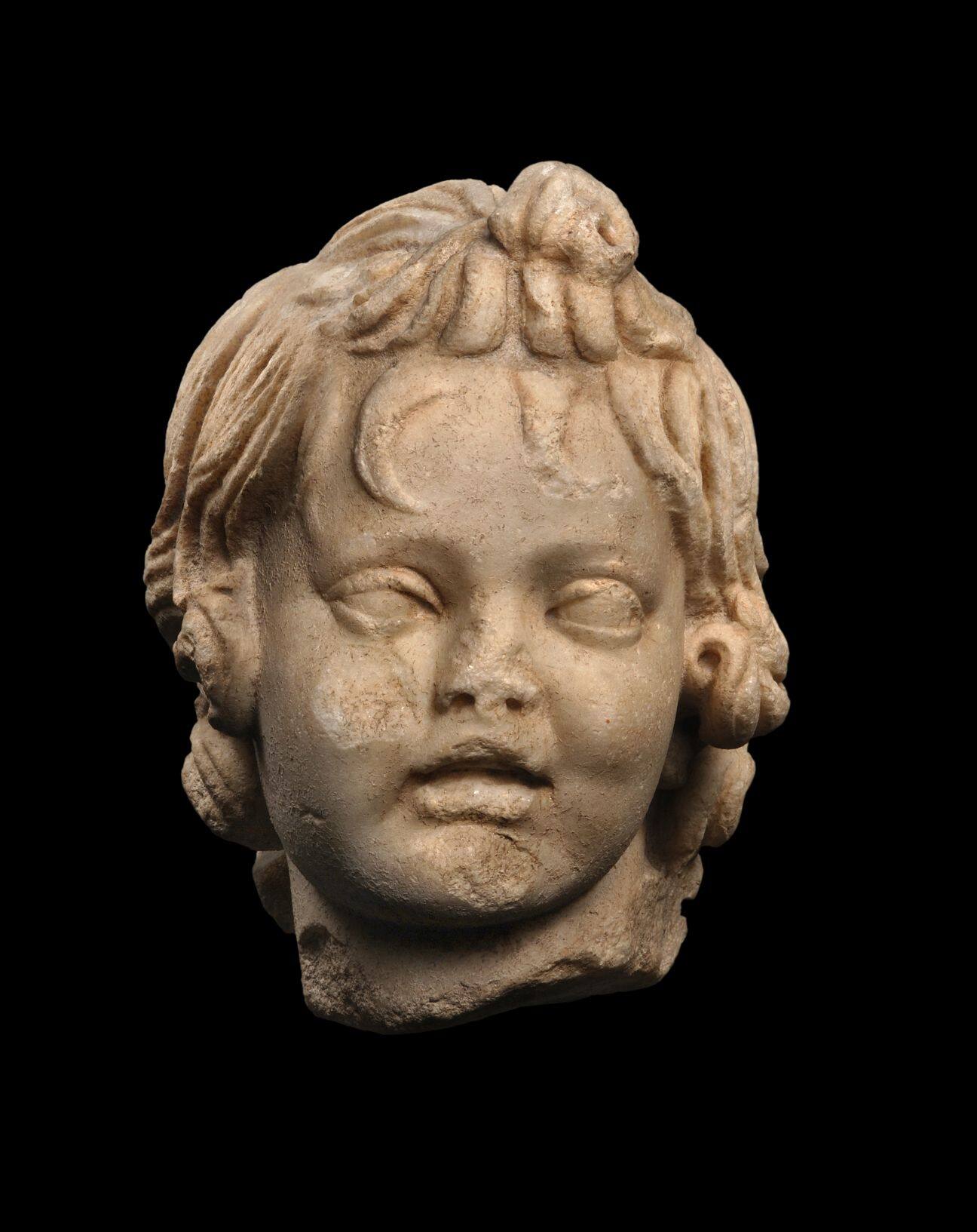 BeschreibungDer Marmorkopf gehörte ursprünglich zur Skulptur eines lebensgroßen Knaben, der mit einer Gans ringt. Im Unterschied zu anderen Repliken stemmt der Knabe sein Kinn hier nicht auf die Brust, nahm in der Komposition also wohl eine etwas souveränere, weniger angestrengten Haltung ein. Die römische Kopie nach hellenistischem Original stammt aus der Sammlung Eberle.Objektnr.KLA-Or-8503