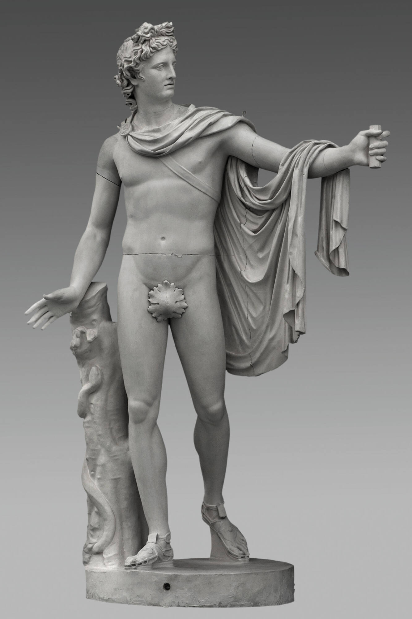 BeschreibungSpät erst setzte sich von dieser berühmten Statue die Erkenntnis durch, dass sie die kaiserzeitliche Marmorkopie eines wohl bronzenen Originals der griechischen Spätklassik ist. Gleichwohl gehört der Apoll vom Belvedere (so genannt nach seinem Aufstellungsort im Vatikan) zu den Ikonen der neuzeitlichen Antikenbegeisterung und war der unumstrittene Posterboy des europäischen Klassiszismus.Kaum bekannt ist hingegen der antike Kontext der Figur, die Apollon als unangestrengt aus der Ferne treffenden jungen Jüngling mit langem, zu einer Schleife aufgebundenen Haar zeigt.