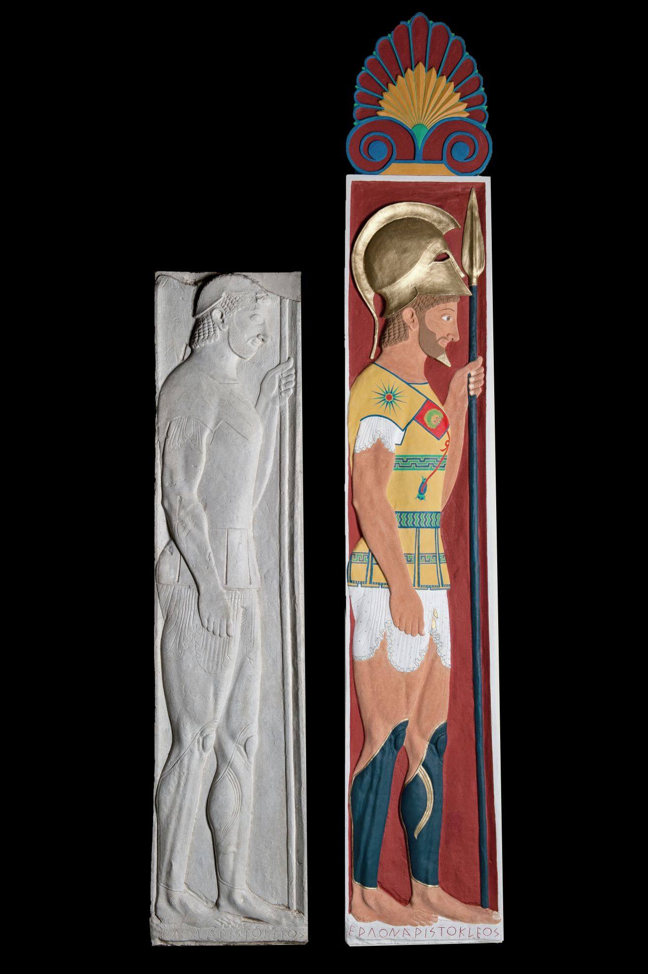 BeschreibungDie Grabstele zeigt in Relief einen gerüsteten und bewaffneten Krieger im Profil. Über dem kurzen Unterkleid trägt er einen schweren ledernen Brustpanzer, dazu Beinschienen und einen Helm; die linke Hand hält eine Lanze. Farbreste, geglättete Flächen und Löcher für Anstückungen zeigen, dass die Stele ursprünglich vollständig bemalt und der Helm, die Lanzenspitze, die Bartspitze und das Glied des Mannes in Bronze angesetzt waren. Dies wurde in der Rekonstruktion – aus dem Jahr 2005 – ebenso wiedergegeben wie die verlorene Bekrönung der Stele mit einer Palmette. Der hier zu sehende Gipsabguss stammt aus Berlin und wurde 1867 für Tübingen erworben.Objektnr.KLA-Gi-1250