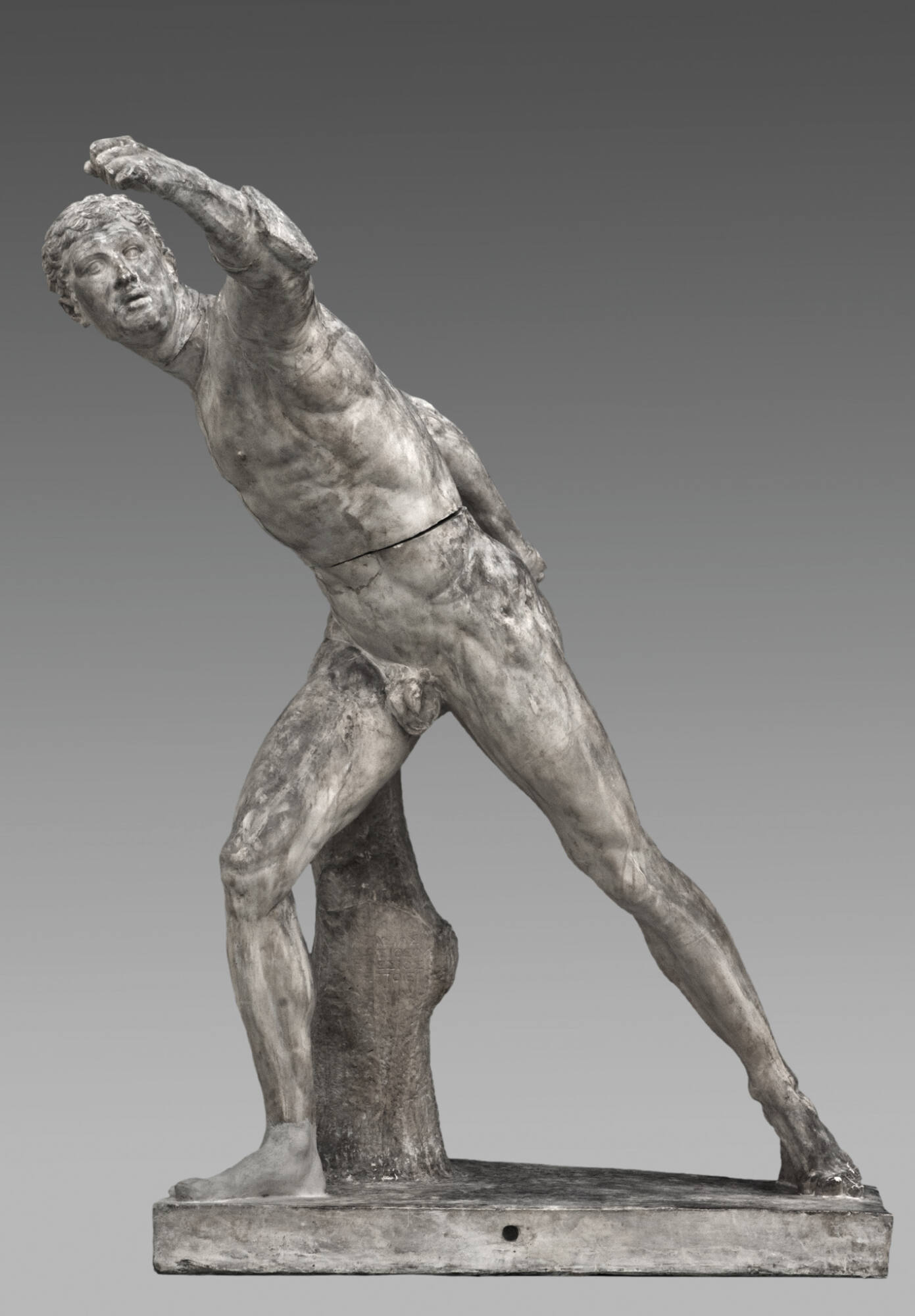 BeschreibungDie Statue eines Schwertkämpfers im Ausfallschritt - der erhobene linke Arm führte den Schild, die zurückgenommene Rechte holte zum Stich aus - stammt aus einer kaiserzeitlichen Villa bei Antium und dürfte schon zur Ausstattung des spätrepublikanischen Vorgängerbaus gehört haben. Ein Signatur des Künstlers, Agasias von Ephesos, wies den Betrachter stolz auf den griechischen Bildhauer hin, der die Statue geschaffen hatte. In der Forschung hat sich die Ansicht durchgesetzt, dass es keinen Gegner zu der Figur gab, man spricht paradoxerweise von einer 'Einfigurengruppe'. Zugleich lassen Haltung und Kopfwendung keinen Zweifel, dass der Krieger in Auseinandersetzung mit einem von erhöhter Position, wohl zu Pferd kämpfenden Gegner gedacht war - woraus seiner ausgeprägten Dynamik und Muskulatur ein besonderer Stellenwert zuwächst: es ist ausschließlich sein eigener Körper und dessen Stärke, den er hier mit höchstem Einsatz in den Kampf wirft.Objektnr.KLA-Gi-10