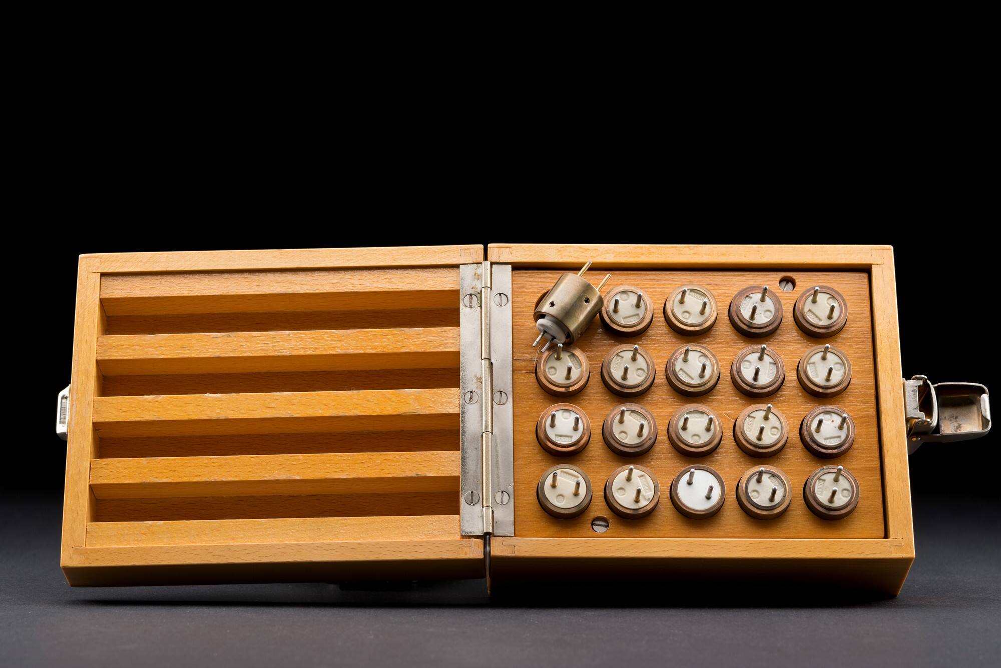 Beschreibung20 Haarnadelkathoden in einem Holzkästchen mit Klappmechanismus, angeordnet in 4 Reihen zu je 5 Stück. Teilweise ist der Wolfram-Draht durchgebrannt.Anwendung/Funktionsweise (über Wikipedia, 25.09.14, 11:36 Uhr):