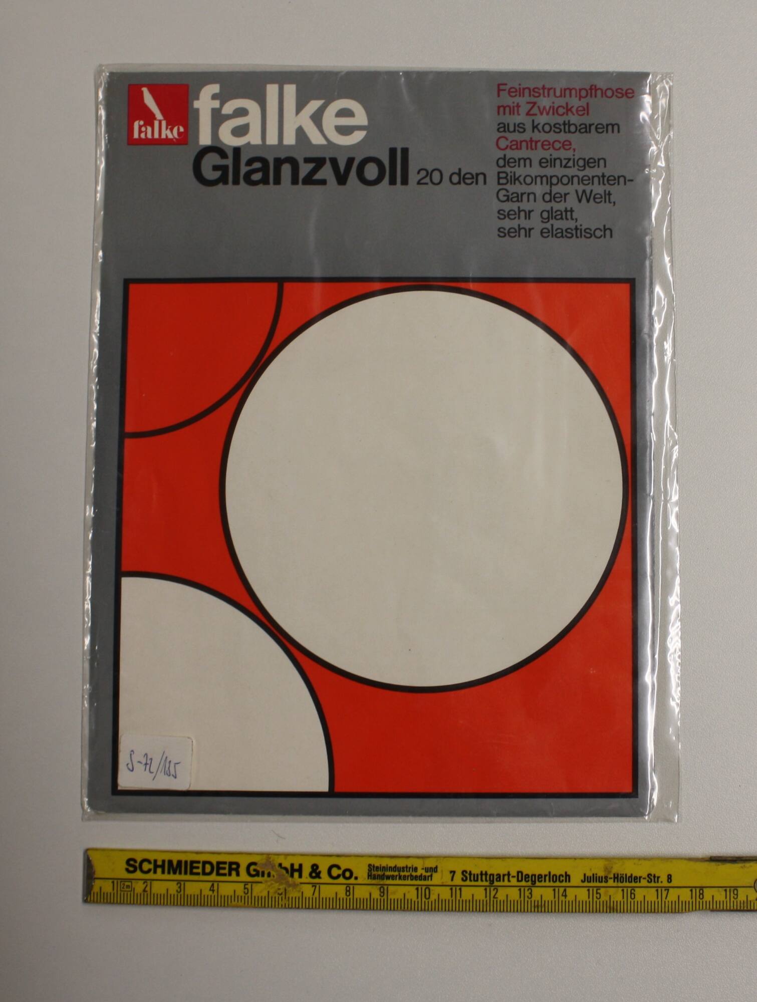 BeschreibungVerpackung für Feinstrumpfhose von Falke;auf der Vorderseite ein Muster aus weißen und roten Kreisen vor rotem Hintergrund. Um dieses Bild ist ein grauer Rahmen, oben steht die Warenbeschreibung.
