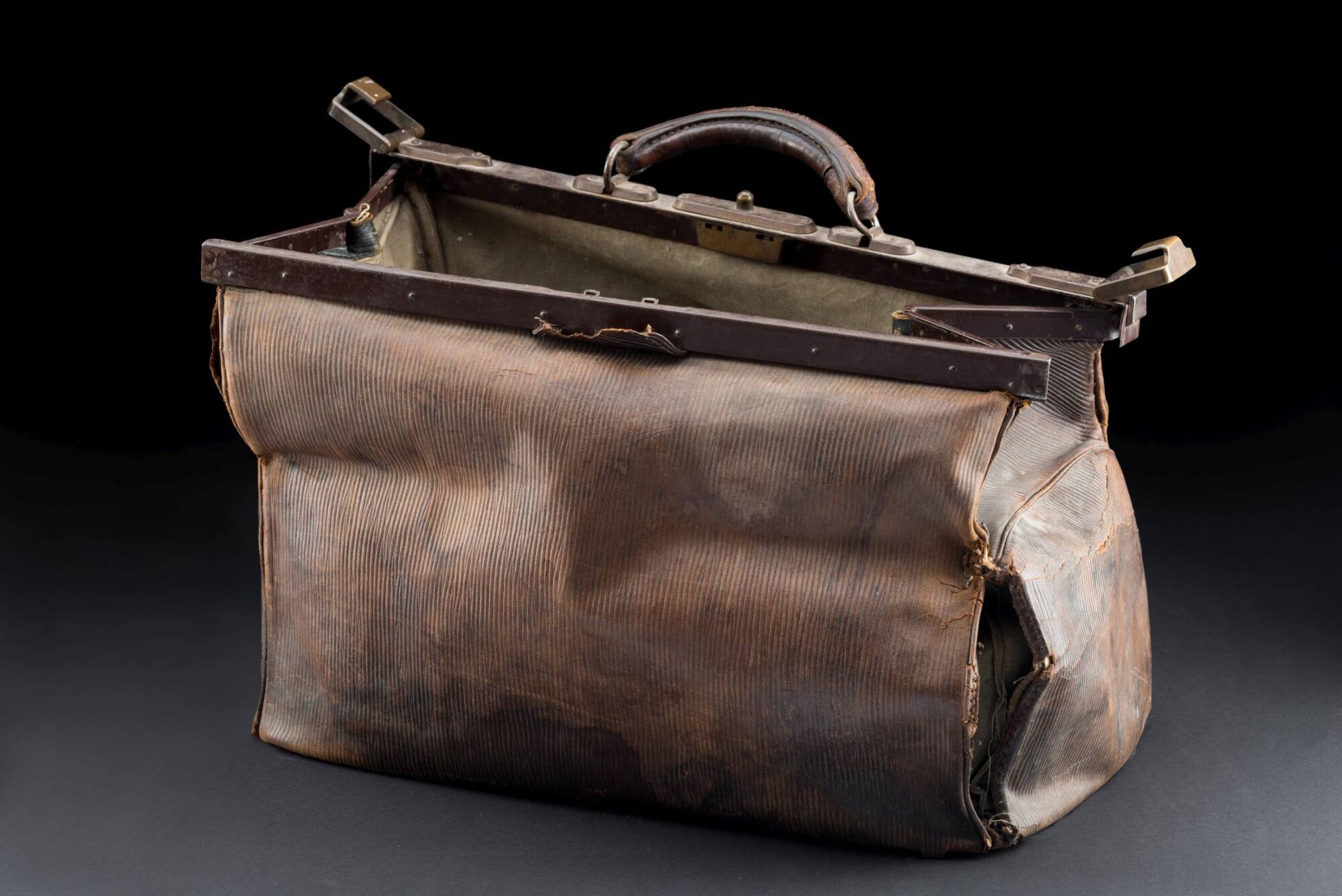 BeschreibungBei diesem Objekt (Tasche) handelt es sich um eine klassische Arzttasche aus braunem Leder. Die Tasche hat eine leicht tonnenartige Form und lässt sich an der Oberseite öffnen, schließen und an einem einzelnen Griff hochheben. Unter dem Griff befindet sich ein Verschluss auf den der Name G. Kolb graviert ist, der auf den ehemaligen Besitzer dieser Tasche, den Tübinger Arzt Gerhard Kolb, hinweist.Die Tasche ist von innen mit grünlich-verblichenem Stoff ausgeschlagen und enthält über 50 Gegenstände, die zum größten Teil medizinische Instrumente aus Metall sind. Alle Gegenstände, bis auf Kunststoffrollen und ein Haemometer, liegen lose und durcheinander in der Tasche.