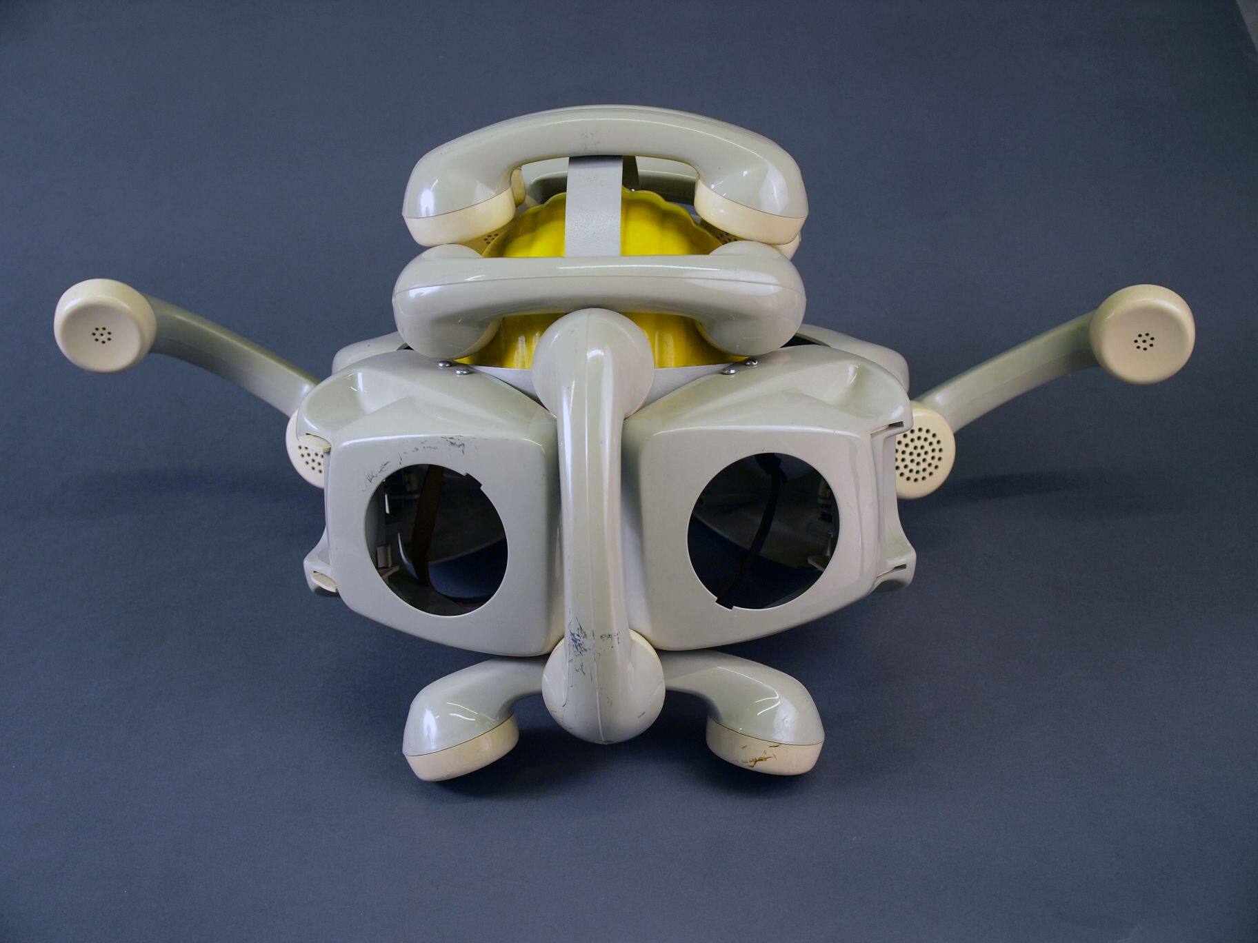 BeschreibungDie Telefon-Maske ist eine von ursprünglich vierzehn, die von einer Lehrlingsgruppe des Fernmeldezeugamts Rottenburg a. N. für die Straßenfastnacht 1983 angefertigt wurde. Sie besteht aus einem gelben Posthelm, grauen Telefonhörern und Telefongehäusen sowie einem Lederriemen. In die Sammlung kam sie im Rahmen des Studienprojekts „Wilde Masken“ 1988 unter der Leitung von Gottfried Korff.MaßeL x B x H: 45 × 74 × 35 cm (450 × 740 × 350 mm)