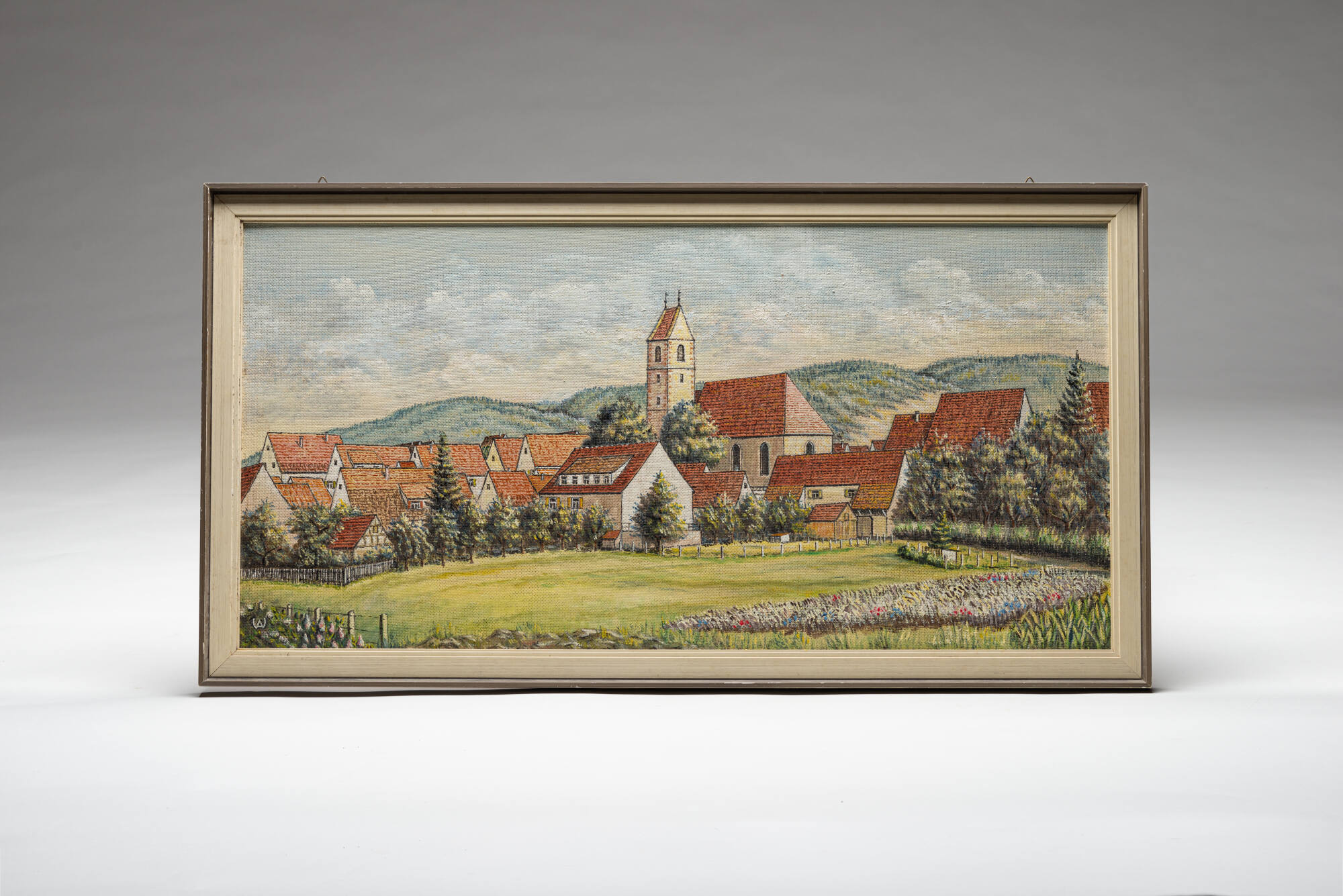 BeschreibungMalerei auf Holz im Rahmen. Bild einer Ortschaft, wahrscheinlich Kiebingen.Das Gemälde ist vermutlich im Zusammenhang mit dem Studienprojekt Utz Jeggles zur Dorfentwicklung am Beispiel Kiebingens entstanden. Aufgrund der Annahme, dass Hermann Bausinger Heimatverbunden sei, wurde ihm das Bild im Anschluss an das Projekt überlassen. Herr Bausinger hängte es in seinem Büro nie auf, es stand hinter einer Palmenpflanze.