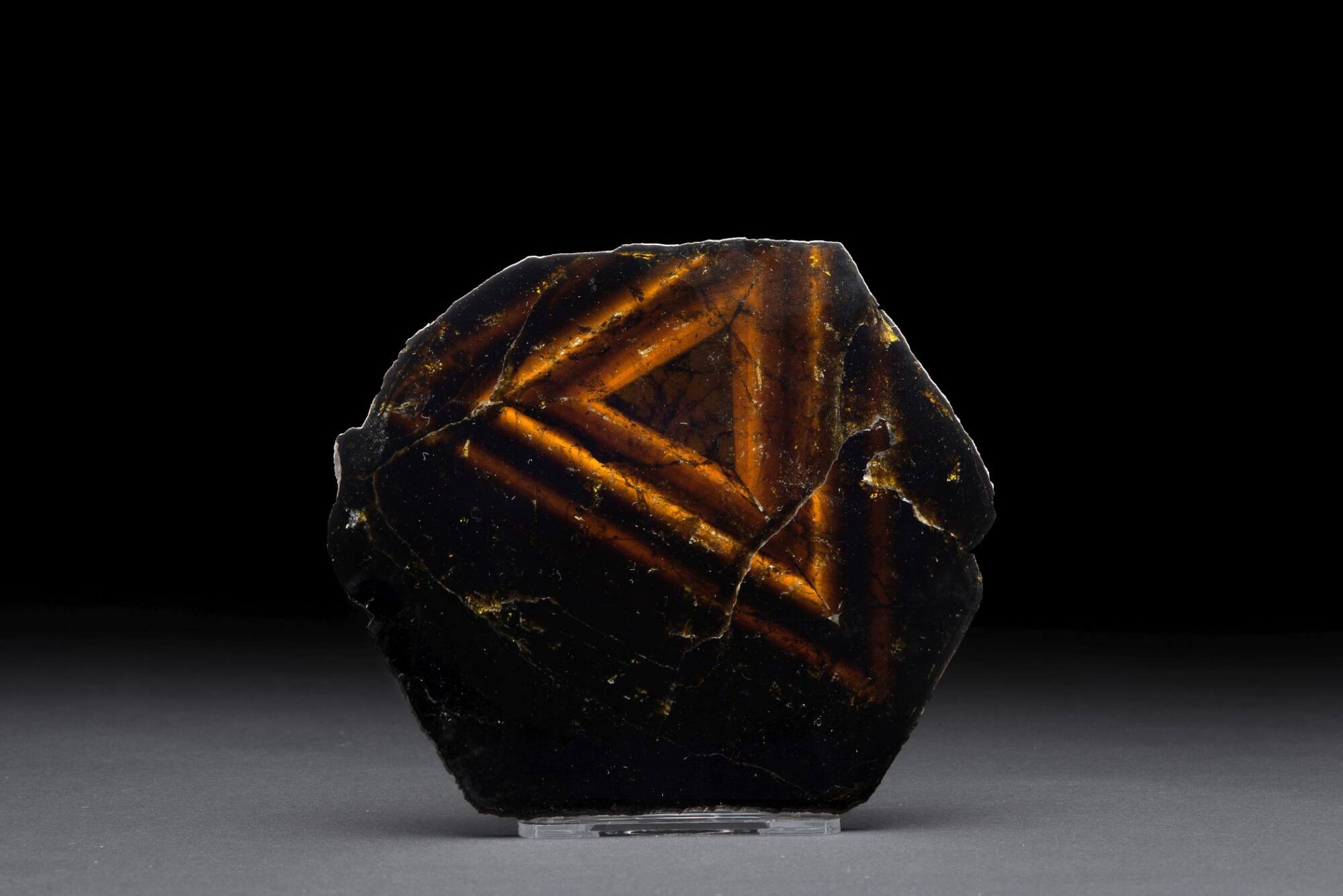 BeschreibungDer dunkle Turmalin, auch Schörl genannt, wirkt als ganzer Brocken zunächst sehr schlicht. Erst bei der Durchleuchtung einer dünnen Scheibe entfaltet er seine kristalline Pracht. Die Farbzonierung ist die Folge von unterschiedlich starkem Eiseneinbau im wachsenden Kristall.Objektnr.MGD-Ms-10
