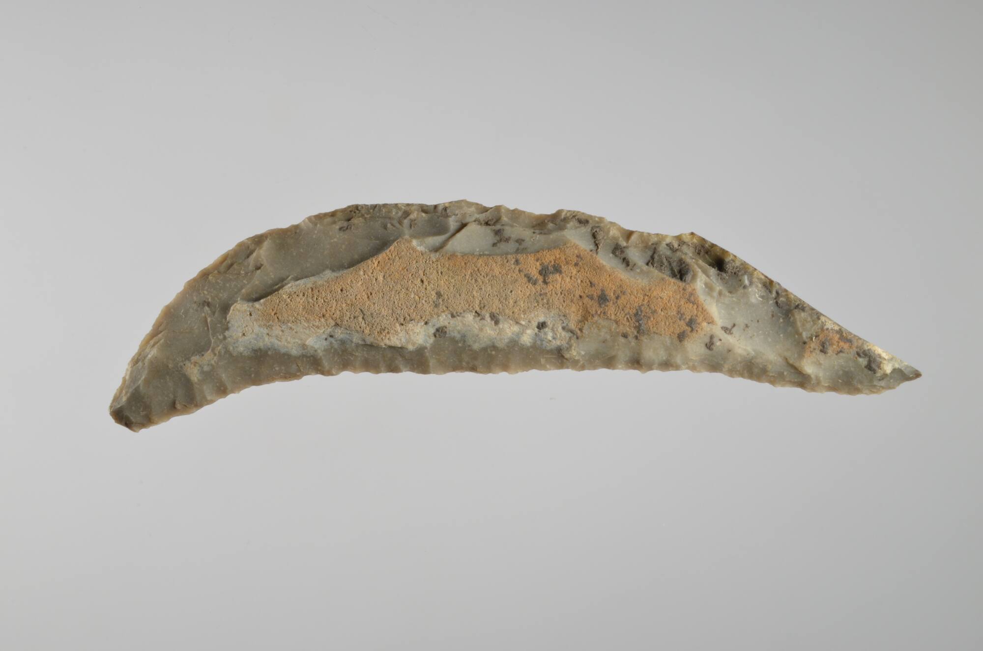 BeschreibungDas große, bogenförmige Sichelmesser wurde am Rücken stumpf und an der Schneide scharf retuschiert. Die Rundung ist sehr gut herausgearbeitet. Die Sichelklinge ist, anders als die meisten Stücke auf dem Kirchberg, nicht aus lokalem Material, sondern aus importiertem Plattensilex. Die bräunliche Rinde des Silex wurde fast vollständig entfernt. Ursprünglich war es in einen Griff, wahrscheinlich aus Holz, geschäftet und mit Pech verklebt. Sichelklingen aus einem Stück sind eher ungewöhnlich und eine Innovation des Jungneolithikums, da meist mehrere kleine Klingen nebeneinander, schräg oder parallel, geschäftet waren. Sicheln, welche zur Getreideernte benötigt wurden, verbreiteten sich zusammen mit dem Ackerbau und der Viehzucht ab ungefähr 5500 v. Chr. in Mitteleuropa. Sie entstanden um 8800 v. Chr. in Vorderasien, von wo aus sie sich verbreiteten. Die starke Lackpatina (sog. Sichelglanz) an der Schneide zeigt, dass dieses Stück tatsächlich zum Schneiden von Getreide verwendet wurde.MaßeLänge: 14,1 cm