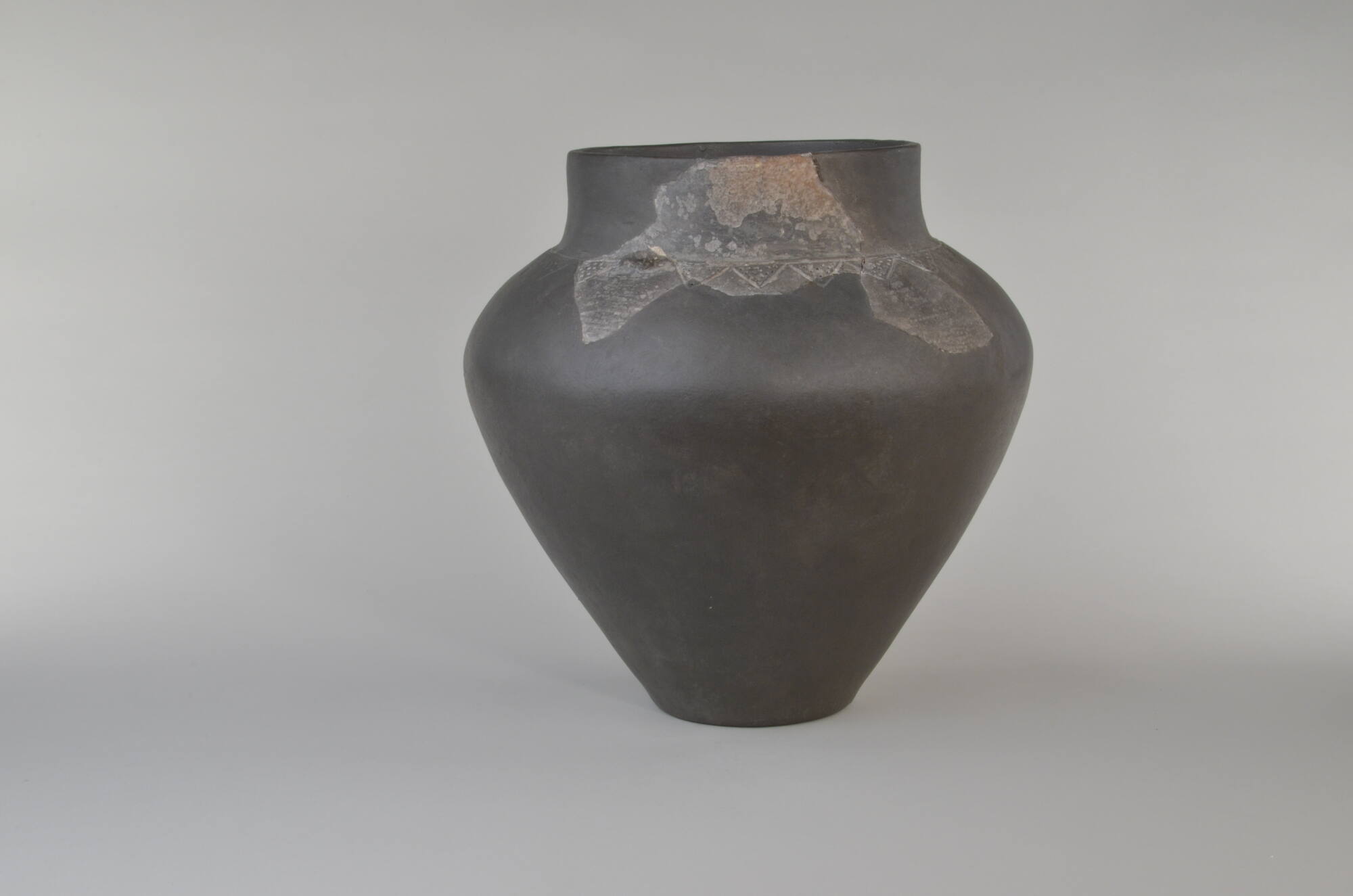 BeschreibungVon diesem Zylinderhalsgefäß sind noch einige größere Scherben des Gefäßoberteils erhalten. Der Hals ist abgesetzt und glatt abgestrichen. Die äußere Glättung, die schwarzgraue Farbe und die geringe Kalksteinmagerung aus lokalem Kalkstein weisen das Gefäß der Feinkeramik zu, welche tendenziell dunkler ist als die gröbere Wirtschaftsware. Auf dem Schulterabsatz wurde eine kräftige Griffwarze aufgesetzt. Rechts und links der Warze ist noch die Verzierung aus hängenden, punktstrichgefüllten Dreiecken zu sehen. Diese sind ein charakteristisches Ziermotiv der nordalpinen Frühbronzezeit und meist entlang einer Leitlinie auf der Gefäßschulter angebracht. Die Dreiecke enden an der Griffwarze. Sie laufen nie unter Gefäßapplikationen hindurch. Selten werden in der Archäologie vollständige Gefäße gefunden, doch ermöglichen Rand- und Bodenscherben eine Rekonstruktion. Dabei werden die Fehlstellen zwischen den gereinigten und passgenau verklebten Scherben mit Gips ergänzt und anschließend coloriert.