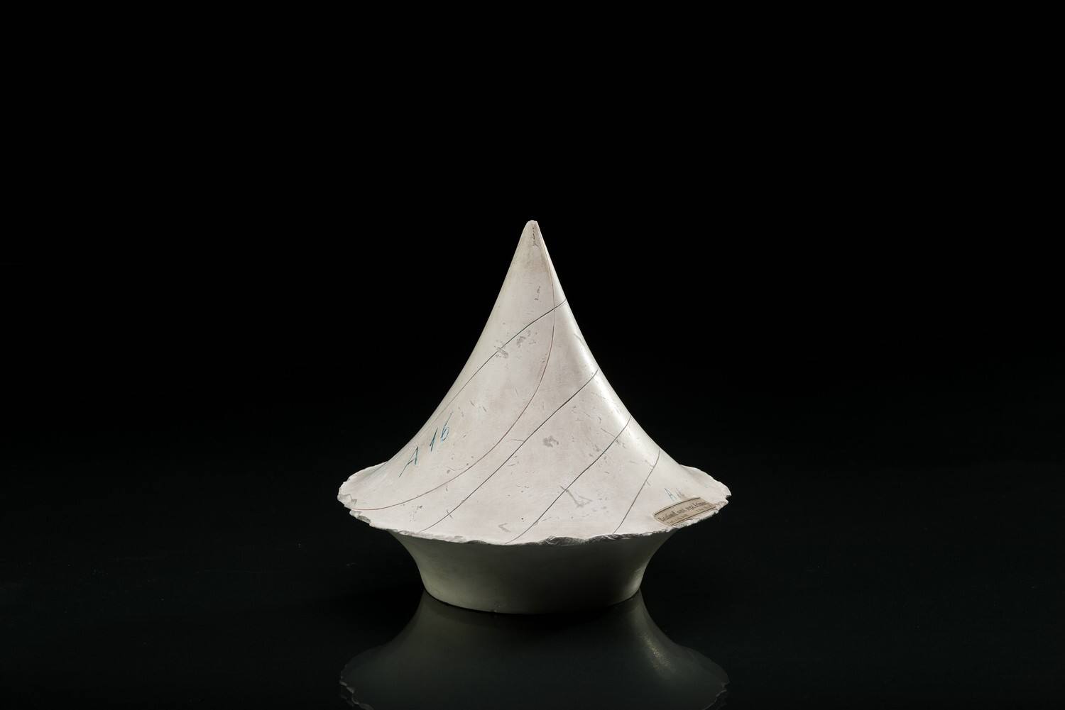 BeschreibungRotationsfläche von constantem negativen Krümmungsmass (Kegel-Typus) nebst geodätischen und Asymptoten-Linien. Von stud. math. I. [Isaak] Bacharach (Ludwig Brill, Catalog mathematischer Modelle, [1. Aufl. 1881] 3. Aufl. Darmstadt 1885, S. 5.)