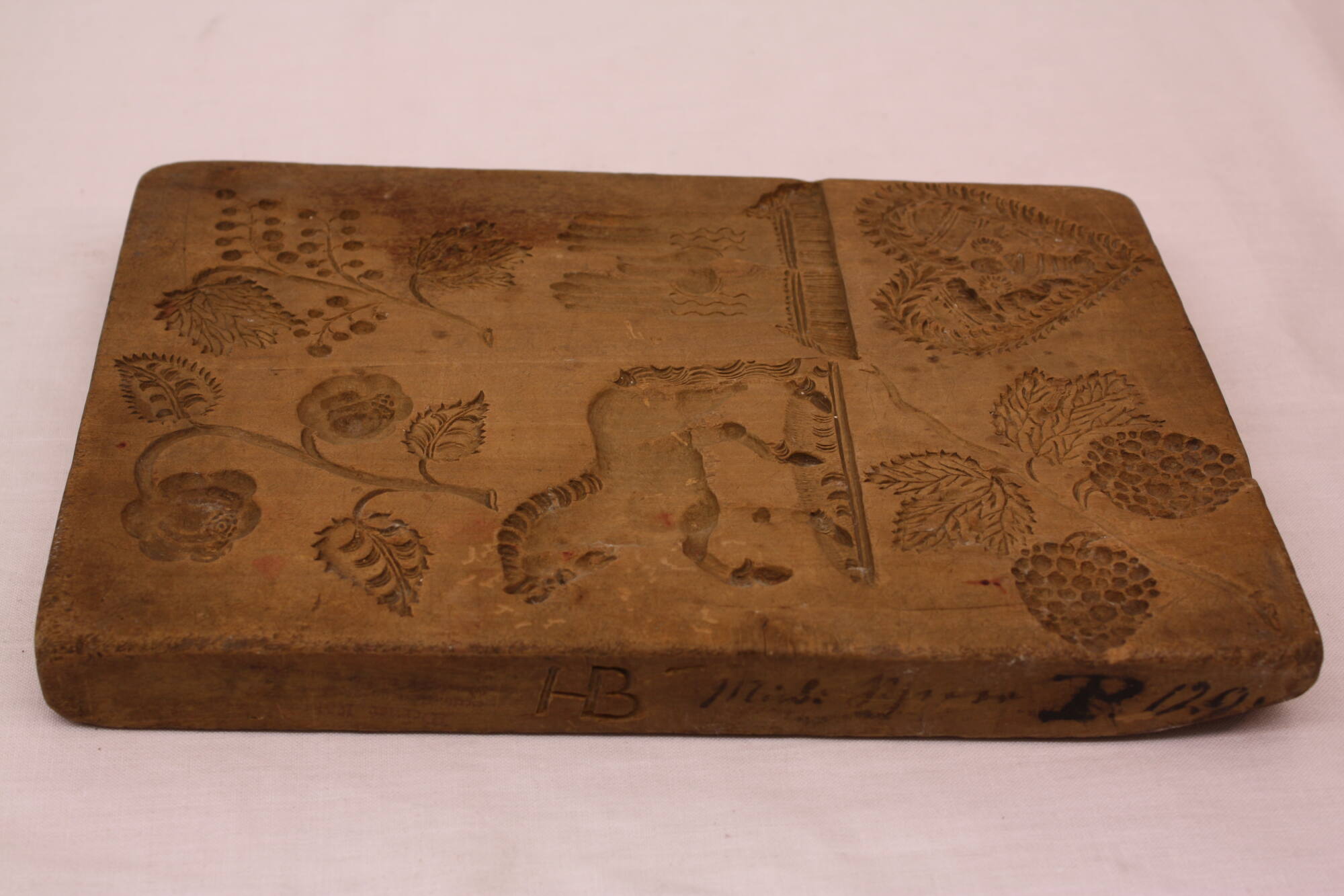 1) Blume mit Blättern, Pferd, Paar Handschuhe, Herz mit Wickelkind, Beere