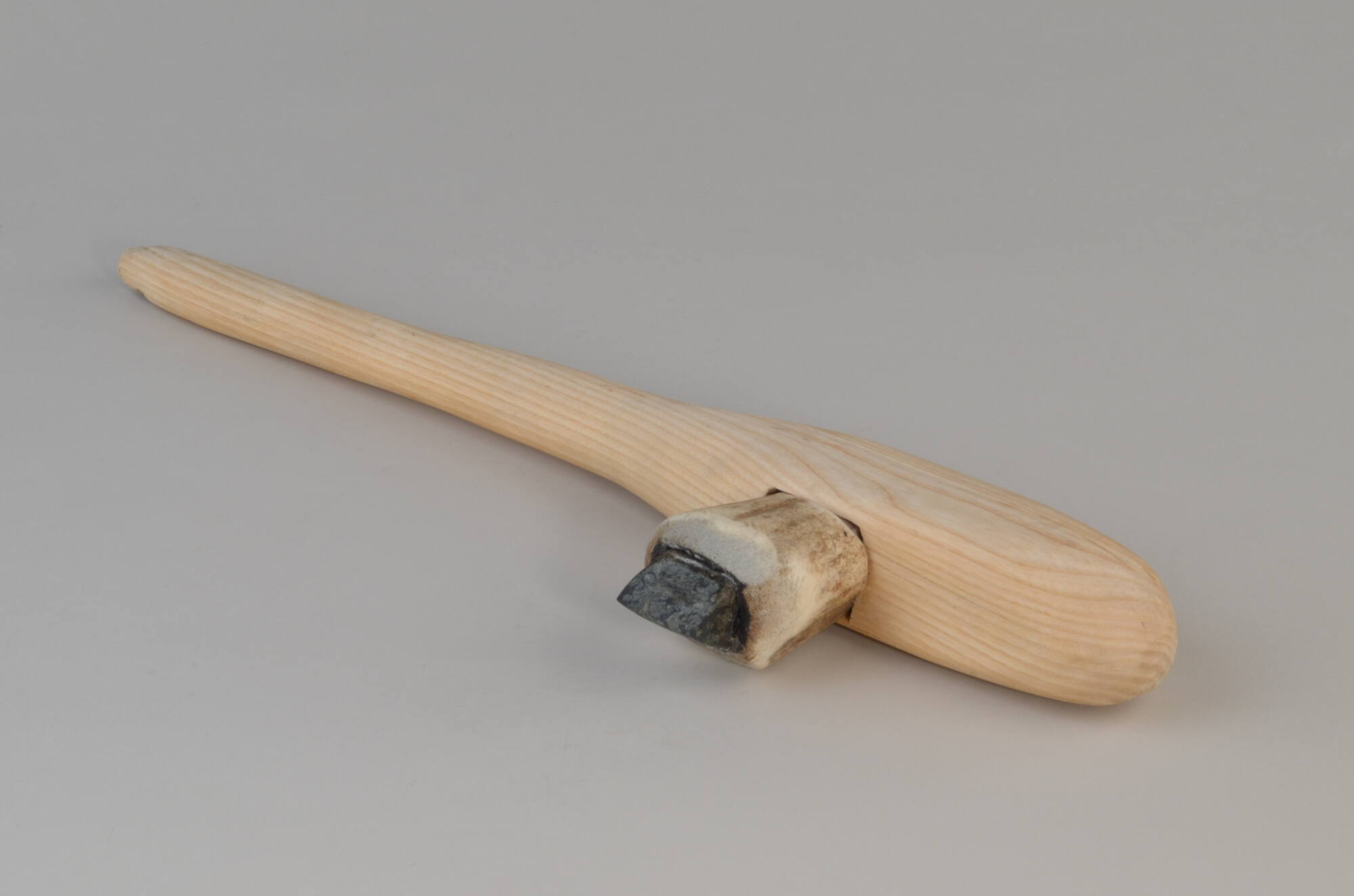 BeschreibungRekonstruktion eines Steinbeils bestehend aus einem Holzholm, einem Hirschgeweihzwischenfutter und einem Steinbeil. Im Neolithikum nahm der Bedarf an Fläche und Holz durch die Sesshaftwerdung und den Ackerbau stark zu, weswegen Steinbeile zur Rodung eine wichtige Rolle spielten. Steinbeile waren in einen Holzholm geschäftet und damit dieser beim Hieb nicht brach, wurde ein Zwischenfutter (oder auch Geweihtülle) als Puffer dazwischen eingesetzt. Steinbeile werden auch heute noch häufig gefunden, da Stein nicht vergeht. Die Zwischenstücke sind deutlich seltener. Der hölzerne Holm kann sich nur unter ganz bestimmten Bedingungen erhalten. Einige wurden in jungsteinzeitlichen Seeufersiedlungen entdeckt, wo die Erhaltungsbedingungen für Holzobjekte besonders gut sind. Auf Grund dieser Funde konnte diese Rekonstruktion vorgenommen werden.MaßeLänge: 50 cm