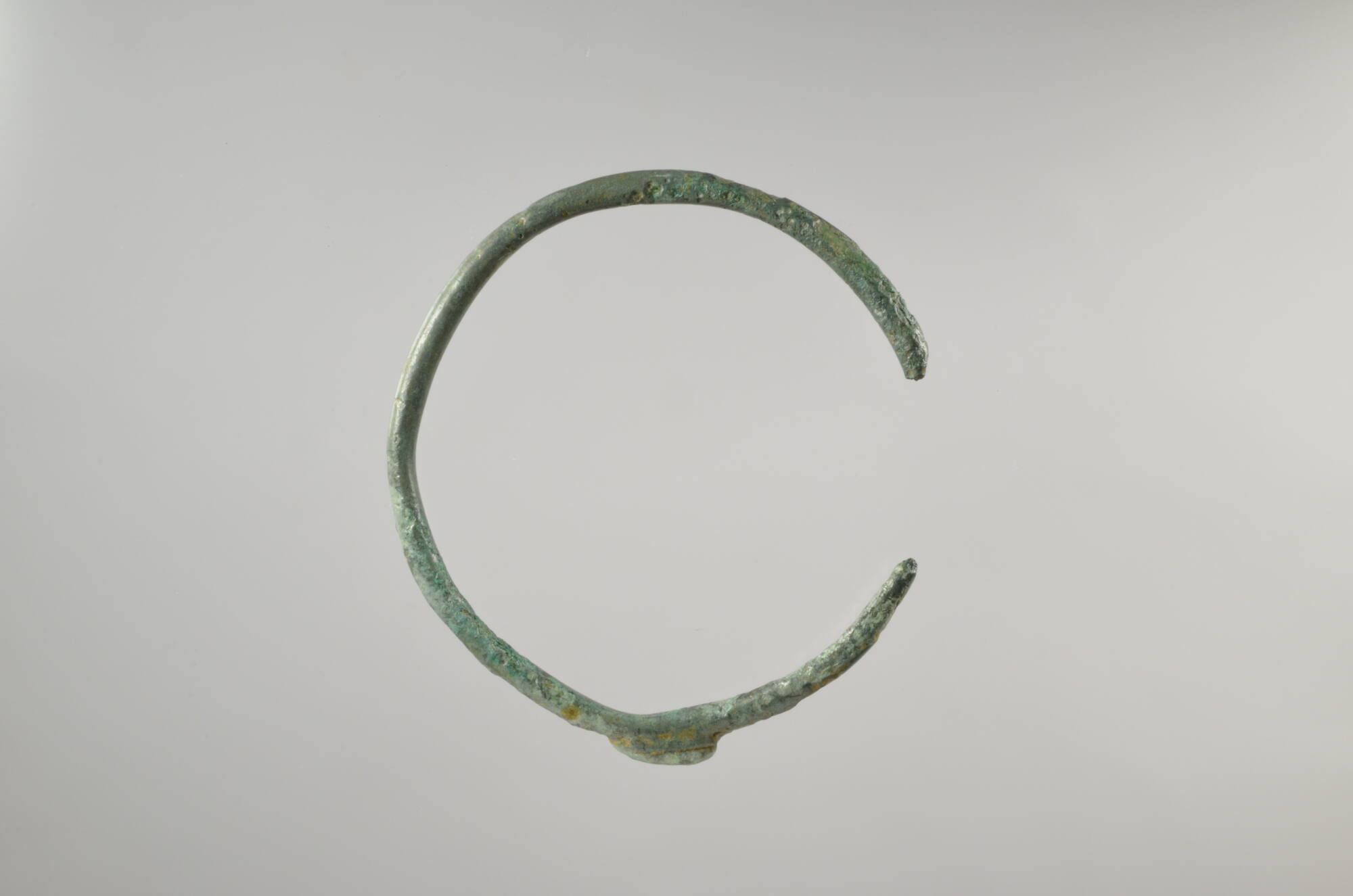 BeschreibungEin unvollständiger Bronzering mit Gußzapfenrest, welcher keinem bestimmten Grabhügel aus Rommelsbach mehr zugeordnet werden kann.MaßeDurchmesser: 8,1 cm