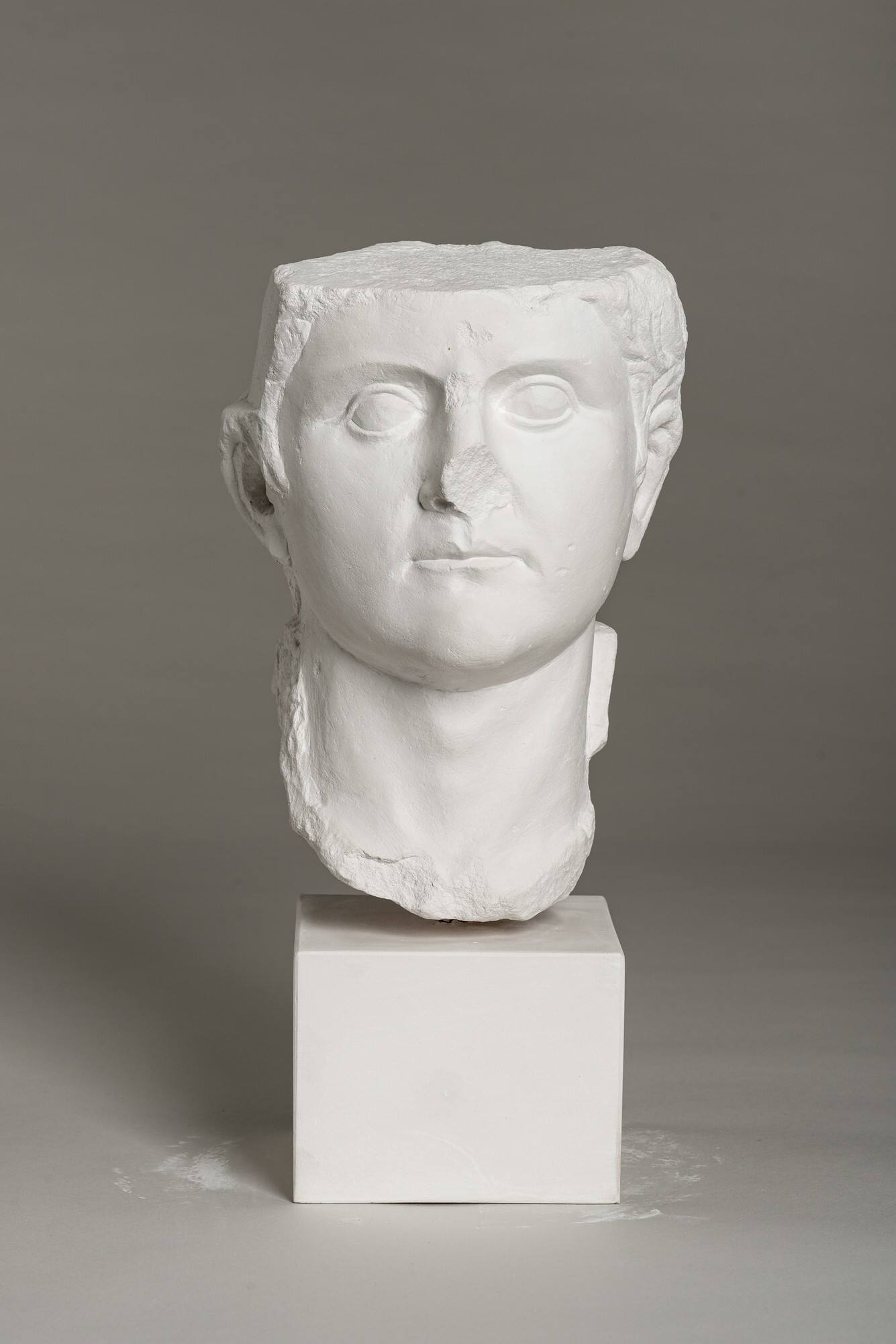 BeschreibungDer Kopf, dessen Original zu den Beständen der Tübinger Antikensammlung gehört, war nicht aus einem Stück gearbeitet, vielmehr war ein Großteil der Kopfkalotte, der Haarpartie und des über den Hinterkopf gezogenen Gewands, das den Dargestellten als Kultausübenden kennzeichnet, in separat gearbeiteten Stücken an den Kopf angesetzt.Objektnr.KLA-Gi-1078