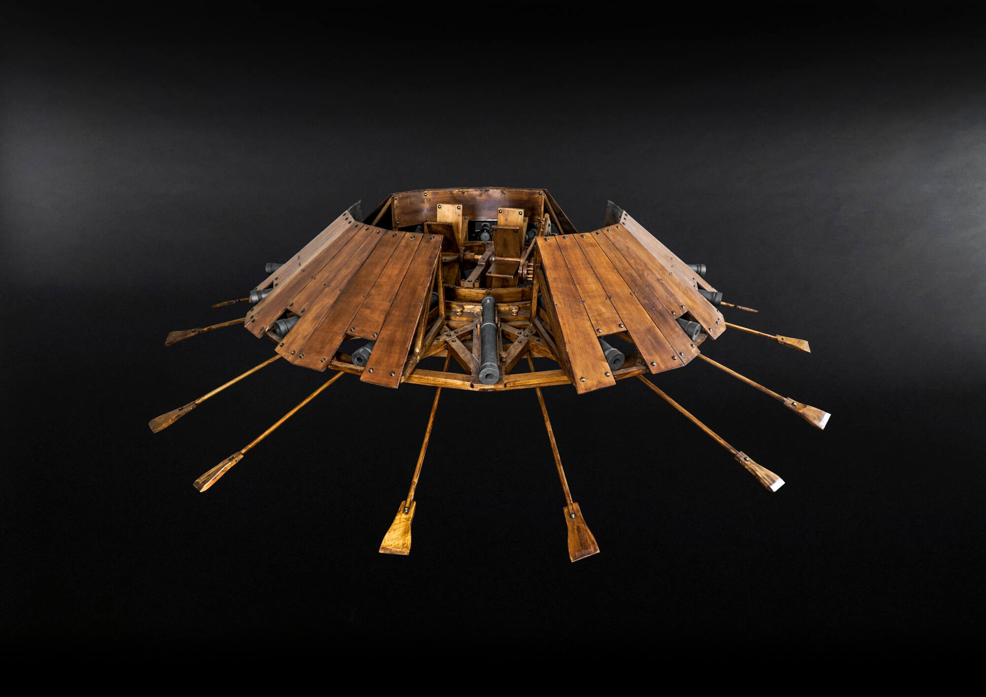BeschreibungUm feindliche Linien zu durchbrechen erdachte sich Leonardo eine in alle Richtungen schießende Feuerwaffe: einen Kreisblitz. Die Zeichnung aus dem Codex Atlanticus zeigt insgesamt 16 Kanonenrohre, die radial um eine Plattform angeordnet sind. In der Mitte treibt ein Zahnradgetriebe durch Muskelkraft entweder Schaufelräder für die Seeschlacht oder Wagenräder für die Feldschlacht an.Die Zeichnung entstand während des zweiten französischen Eroberungsfeldzugs unter König Ludwig XII. gegen Mailand und Neapel. Leonardo trat in dieser Zeit als Militäringenieur und Architekt in die Dienste von Cesare Borgia. Das dargestellte Holzmodell zeigt die Sperrfeuerkanone als Kriegsschiffsvariante.