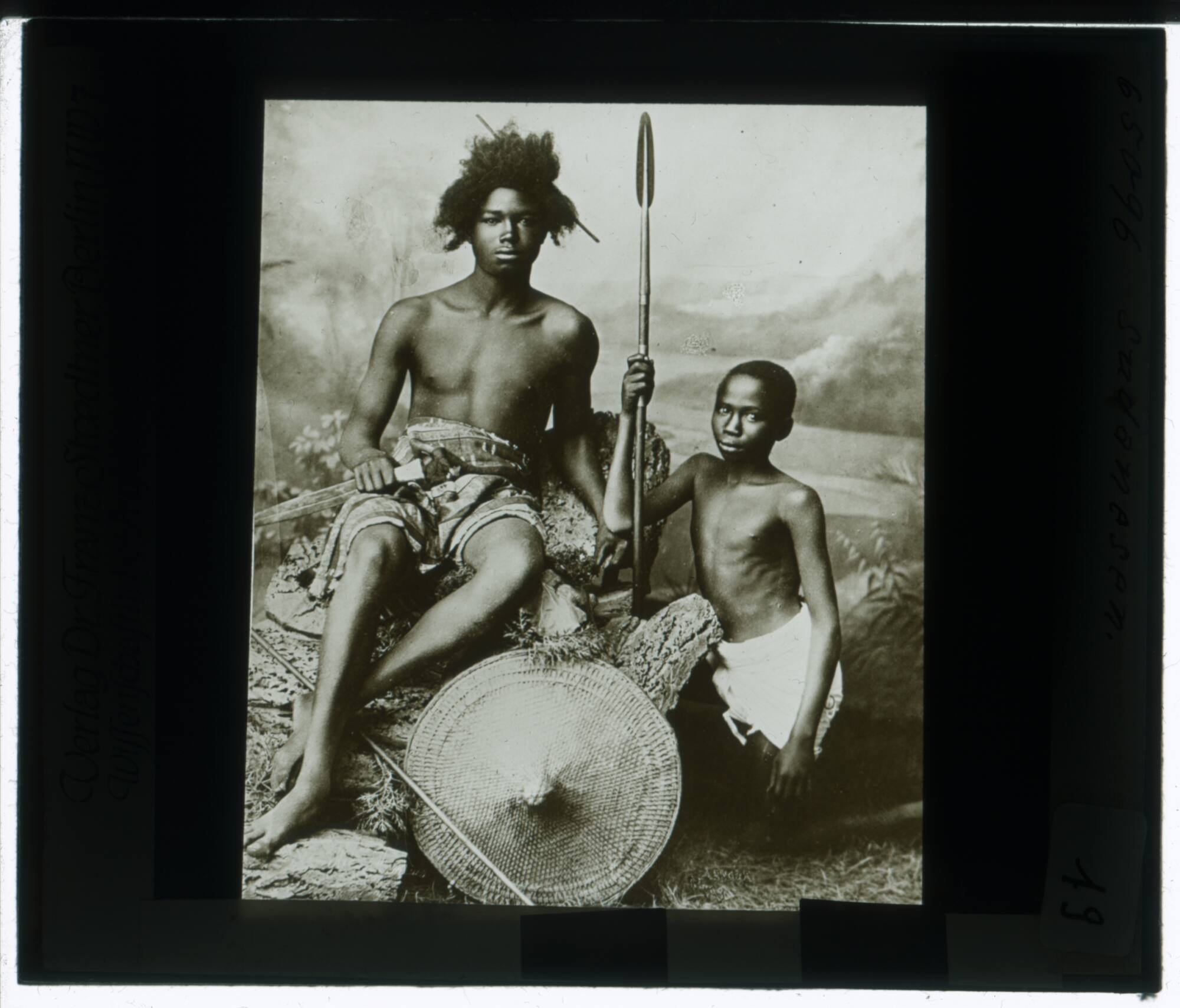 BeschreibungDas Diapositiv zeigt eine Studiofotografie aus dem Angebotsalbum "Album. 210 a. Ethnographie. IV. Teil: Afrika und Amerika." des ehemaligen Berliner Lichtbildvertriebs "Institut für wissenschaftliche Projection" (1895) von Dr. Franz Stoedtner. Zu sehen sind zwei junge Männer mit Speer, Dolch und Schild in einer inszenierten Kulisse vor einer Studioleinwand mit Landschaftsmalerei. Im Album wird dieses Glasdiapositiv mit der Nr.65096 unter dem Titel "Bischarikrieger" aufgeführt. Das Diapositiv wurde von Augustin Krämer (1865-1941), dem Gründer der ethnologischen Sammlung in Tübingen, innerhalb seiner Lehraufträge verwendet.MaßeB x H: 10 × 8,5 cm