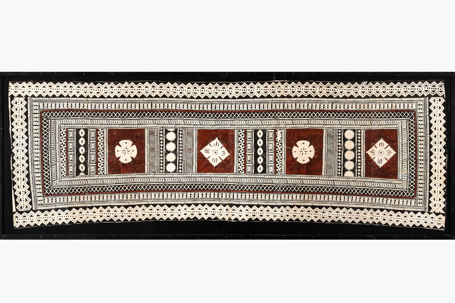 BeschreibungDer Rindenbaststoff ist in strenger Weise ornamental bemalt worden. Er wurde zum Verkauf für Tourist*innen hergestellt.MaßeL x B: 167 × 60 cm