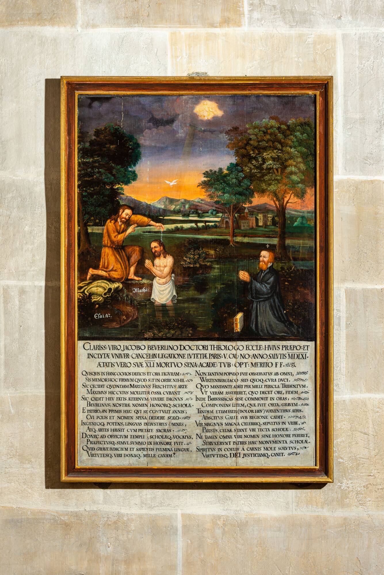 BeschreibungVollständig erhalten hat sich das Grabmonument des Jakob Beurlin (1520–1561), heute im nördlichen Seitenschiff, 1. Kapelle, an der Ostwand. Beurlin wurde 1551 Professor der Theologie in Tübingen. Von einer Parisreise, unternommen 1561 mit Jakob Andreä (1528–1590) und Balthasar Bidembach (1533–1578), kehrte er nicht zurück. Am 28. Oktober 1561 erlag er dem Schwarzen Tod in der Seinestadt, wo er auch beigesetzt wurde. Der obere Teil der seinem Andenken dienenden Holztafel zeigt die Taufe Christi durch Johannes den Täufer in nächtlicher Flusslandschaft. Vom strahlend weißen Lendentuch Christi blickt der Betrachter auf die hell leuchtende Zone der Himmelsöffnung, wo Gott sichtbar wird, und auf die weiße Taube des Heiligen Geistes vor einem rotglühenden – womöglich – Morgenhimmel. Bezüge zum Bildmotiv ergeben sich aus der Inschrift der Holztafel. Sie lobt nicht nur die Verdienste Jakob Beurlins, sondern berichtet auch vom Tod Martin Frechts (1494–1556), seit 1552 Professor der Theologie inTübingen, der „hier“, also wohl in der Kirche, bestattet sei. Martin Frecht führte über Jahre einen theologischen Disput mit Sebastian Franck (1499–1542) über dessen Ablehnung