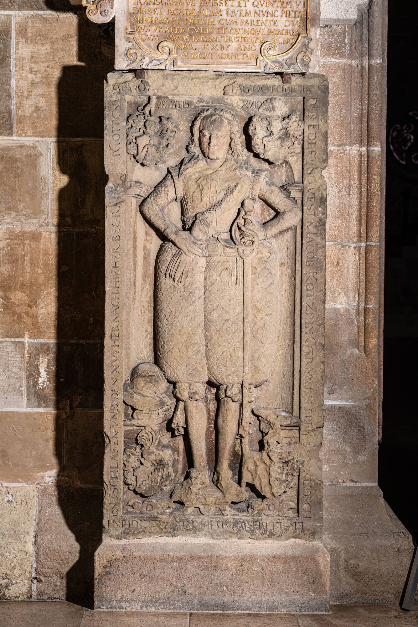 BeschreibungSchließlich stammt auch das steinerne Gedächtnismal in der Vorhalle, gleich links des Portals, aus dem Umkreis Christoph Jelins. Errichtet wurde es für Jakob Kotze (um 1590–1606), einen Studenten aus sächsischem Adel, der im Alter von erst 17 Jahren am 10. Oktober 1606 in Tübingen an den Pocken starb. Das aus mehreren Teilen bestehende Monument beeindruckt durch seine Höhe von über fünf Metern und seine farbige Fassung. Das Hauptfeld zeigt den vor dem Gekreuzigten knienden Verstorbenen. Die rahmenden Säulen präsentieren seine Wappen und somit seine Abstammung. Die Hauptinschrift im Unterhang lobt die Begabung und Tüchtigkeit des Studenten, womit die Tugenden gleichsam zum Fundament des Erinnerungswerkes werden. Zu den Details zählen neben betonten Seitenhängen mit Rollwerk und zwei Karyatiden auch ein Relieffeld mit zwei biblischen Szenen: rechts Jakobs Kampf am Jabbok (1. Mose 32, 23–33), links Jakobs Traum von der Himmelsleiter (1. Mose 28, 10–16). Diese Szenen stellen einen Bezug zwischen dem Vornamen des Studenten und der Bibelfigur her, seinem Namens- und Schutzpatron. Vom Aufsatz des Kotze’schen Monuments blickt als Halbfigur, in Rüstung und farbig gefasst, der Vater des Verstorbenen, Hans Kotze, herab. Darüber findet sich ein Medaillon mit dem Bild der verstorbenen Mutter. Die figürlichen Darstellungen erscheinen hier etwas gröber als die der anderen vorgestellten von Christoph Jelin gefertigten Werke. Das Monument für den sächsischen Adligen stammt wohl eher aus der Werkstatt oder dem Umkreis Christoph Jelins. Jakob Kotze erhielt auch einen Begräbnisplatz in der Stiftskirche. Das beschädigte Grabmal ist neben dem Gedächtnismal erhalten, es zeigt ihn stehend, mit modischer Kleidung, Handschuhen und Degen als Standeszeichen des Adels.Standort: Stiftskirche Tübingen, Vorhalle, Nische gleich links am Eingang, Südwand.