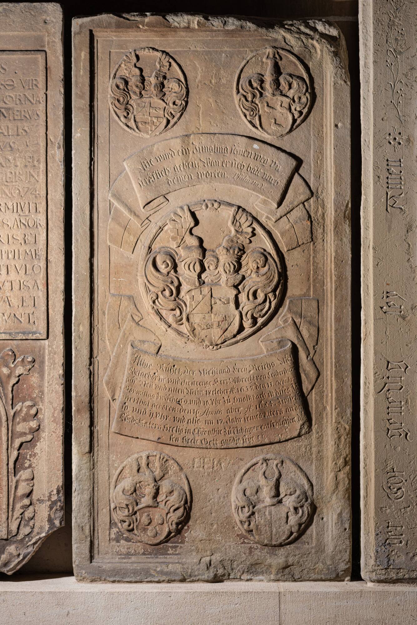 BeschreibungDas erste aus der Zeit nach dem Dreißigjährigen Krieg erhaltene Grabmonument entstand für Albrecht von Lendersheim (1637–1654). Er war 1653134 zum Studium nach Tübingen gekommen und erlag im darauffolgenden Jahr, am 16. April 1657, im Alter von 17 Jahren den Kindsblattern. Sein zur Entstehungszeit wohl bewusst altertümlich anmutendes Gedächtnismal findet man heute in der Vorhalle, rechts des Portals, an der Westwand. Das schlichte Monument präsentiert die kreisförmigen Wappen des Verstorbenen in der Tradition der mittelalterlichen Totenschilde. Auch die Entscheidung die Inschrift in Form von Spruchbändern zu gestalten, weist auf die Zeit des Mittelalters zurück.Standort: Stiftskirche Tübingen, Vorhalle, gleich rechts vom Eingang, Westwand.