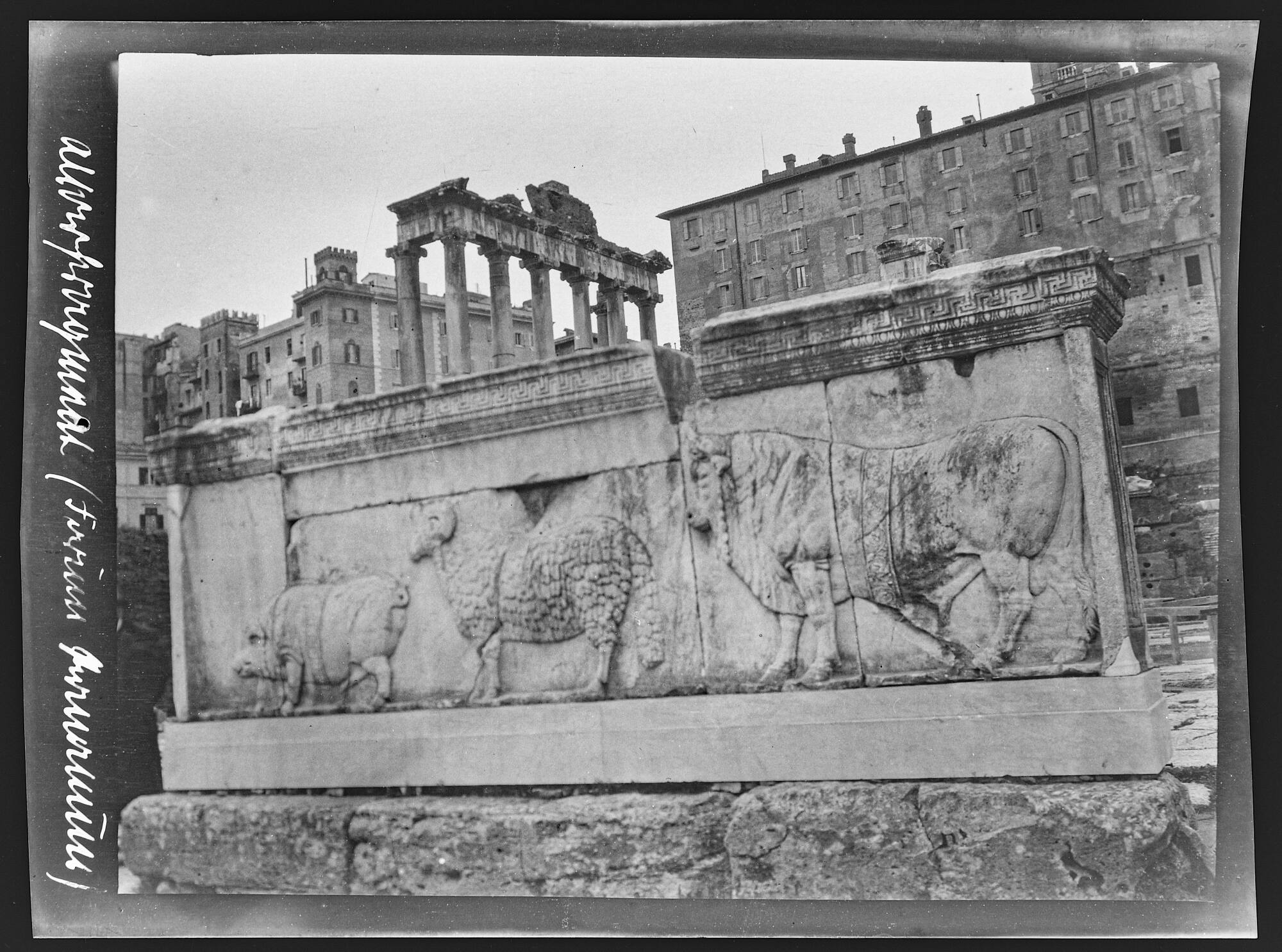 Rom, Suovetaurilienrelief auf dem Forum, im Hintergrund Saturntempel und Tabularium