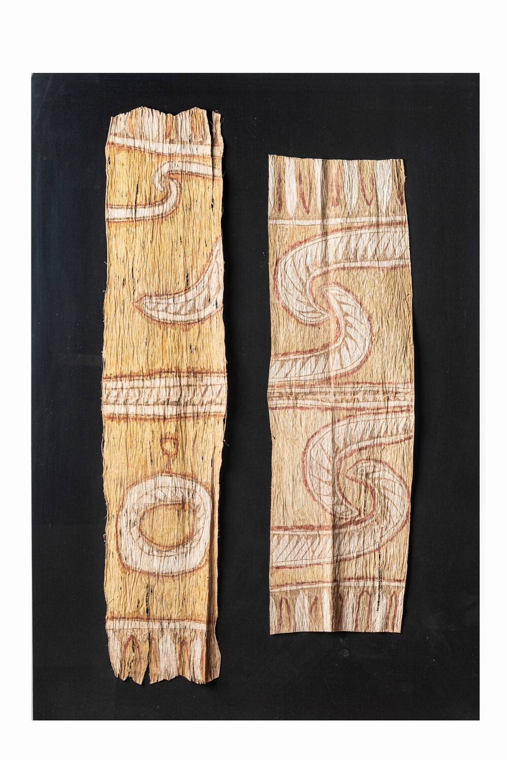 BeschreibungAuf der Fotografie ist der Rindenbaststoff auf der linken Seite zu sehen. Auf der rechten Seite ist ein weiterer Rindenbaststoff (siehe AOI-Es-A940) abgebildet. Beide Textilien stammen aus einer Schenkung von Georg Friederici.