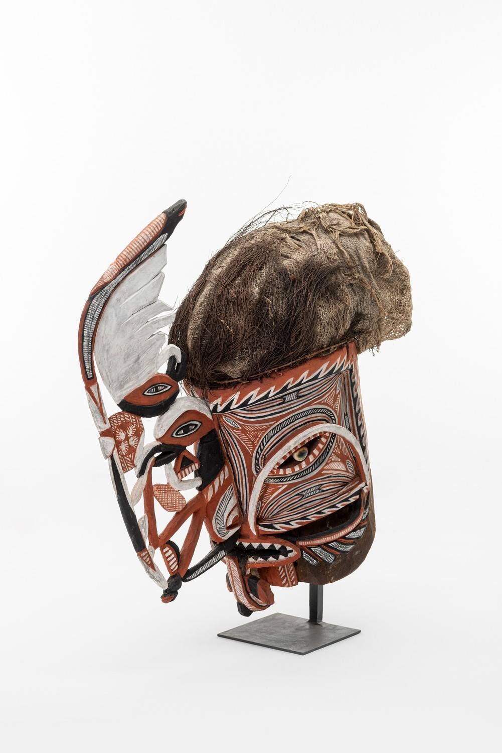 BeschreibungGeschnitzter Kopfaufsatz für eine "Ges" genannte Geistfigur, die aus Pflanzenfasern hergestellt und dann in ihrer Herkunftsgesellschaft zusammen mit dem hölzernen Aufsatz als Skulptur ausgestellt wird.MaßeH x B: 42 × 20 cm
