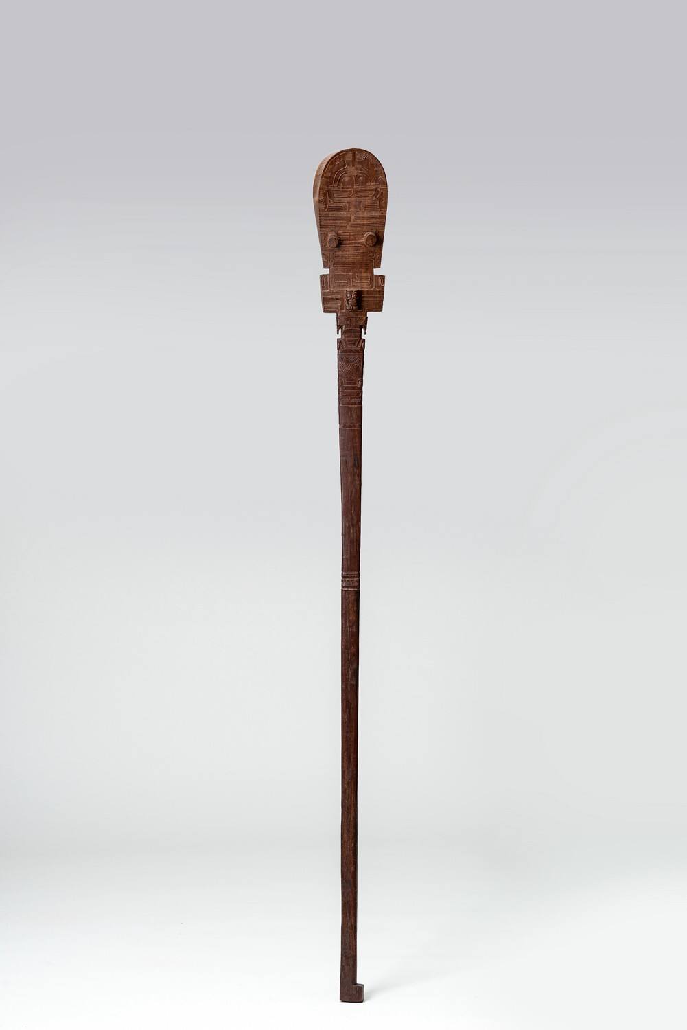 BeschreibungReich beschnitzte Keule mit Tiki-Figuren. Die hier gezeigte Keule war vermutlich für den Verkauf an Tourist*innen bestimmt. Der für die Stärke des Keulenkopfes viel zu dünne Keulenstab und insbesondere der ornamental ausgeschnitzte Übergang zeigen, dass diese Keule nicht mehr für ihren eigentlichen Zweck zu verwenden wäre.MaßeL x B: 131 × 11 cm