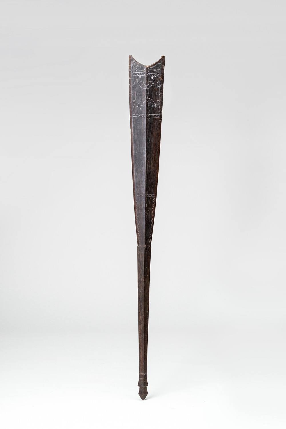BeschreibungDie Kampfkeule "wino - Makana" wird von Männern der Shipibo-Conibo heute nur noch bei Festtänzen getragen, Früher wurde sie als Waffe verwendet. Das Ornament wird mit Kalk in die geschnitzte Kerbe gerieben.MaßeL x B: 122 × 13 cm