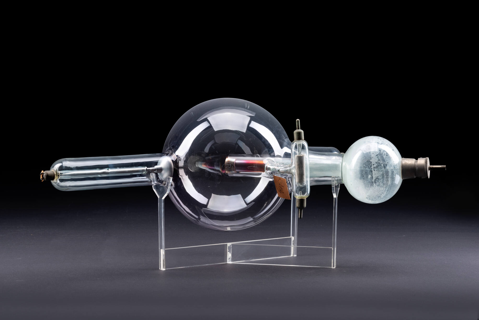 BeschreibungKurz nach der Entdeckung der Röntgenstrahlen im Jahre 1895 begann die Entwicklung von Gerätschaften für die Röntgenaufnahmen. Bei dem abgebildeten Objekt handelt es sich um eine Röntgenröhre, die zur Erzeugung von Röntgenstrahlen verwendet wurde. Unter Hochspannung prallten die beschleunigten Elektronen aus der Kathode auf die Anode. Die dadurch entstandene breitflächige Strahlungsemission wurde anschließend auf Glasplatten, „die mit Silberbromid beschichtet und in schwarzes Papier und Kofferdam-Gummi eingewickelt waren“, belichtet. Man erkannte sehr schnell die Gefahren der Röntgen-Strahlen für den menschlichen Körper. Dank der verbesserten Technologie kann man heute Röntgenbilder wesentlich schneller und mit weniger Strahlung aufnehmen. Schon in den späten 1890er-Jahren entwickelte Walter König (1859–1936) ein Röntgengerät, das mit nur fünf Minuten Röntgenbelichtung ein Bild erzeugen konnte.MaßeH x B x T: 21 × 58 × 28 cm