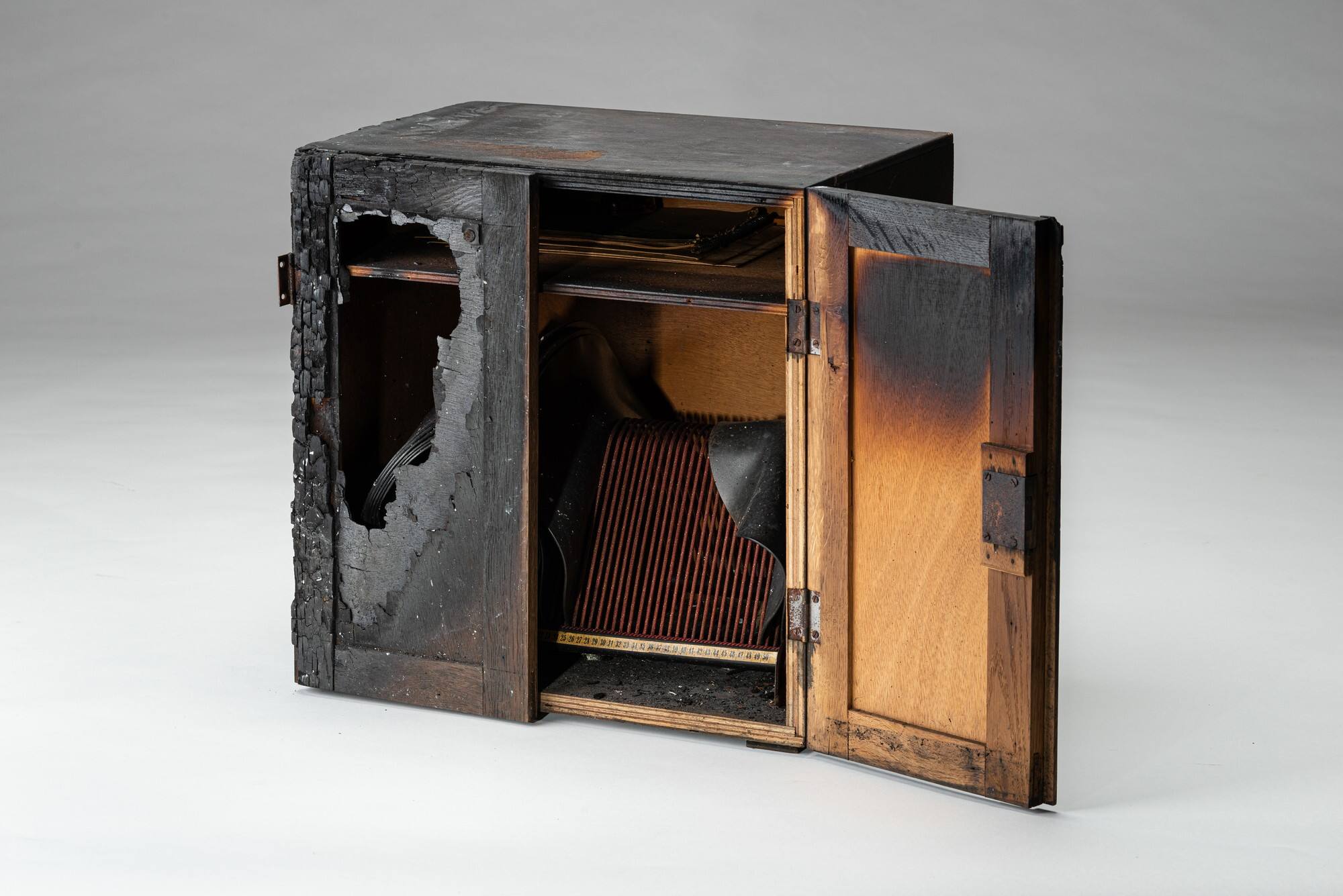 BeschreibungDas hölzerne Schallplattenregal wurde bei dem Brand der ehemaligen Außenstelle der LUI-Sammlung in der Biesingerstraße in Tübingen 2017 stark beschädigt. Die Auswirkungen des Brands werden durch die Rußspuren und das verbrannte Holz direkt sichtbar. Die Flammen brannten ein Loch in die linke Schranktür hinein, durch welches man nun die verbogenen und zerschmolzenen Schallplatten sieht.