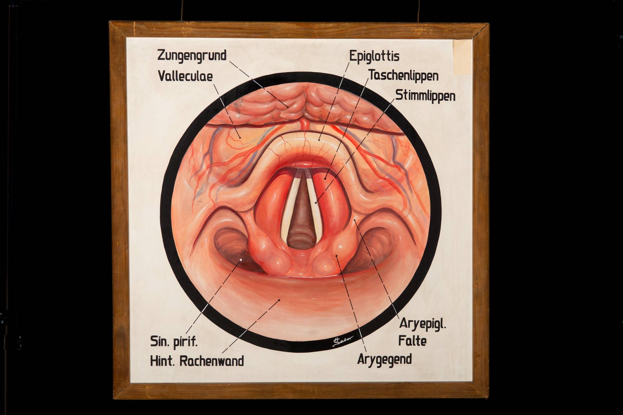BeschreibungBei der Kehlkopfspiegelung (Laryngoskopie) können auch die Stimmlippen, Taschenfalten und die Aryregion bei Atmung und bei Phonation untersucht werden. Zusätzlich wird der Kehldeckel (Epiglottis), der Zungengrund sowie die dazwischenliegende paarige Grube (Valleculae) beurteilt. Dahinter liegen die Rachenhinterwand und die Sinus piriformes, die beidseits der aryepiglottischen Falten bis an den Eingang der Speiseröhre ziehen.MaßeH x B: 142 × 142 cm