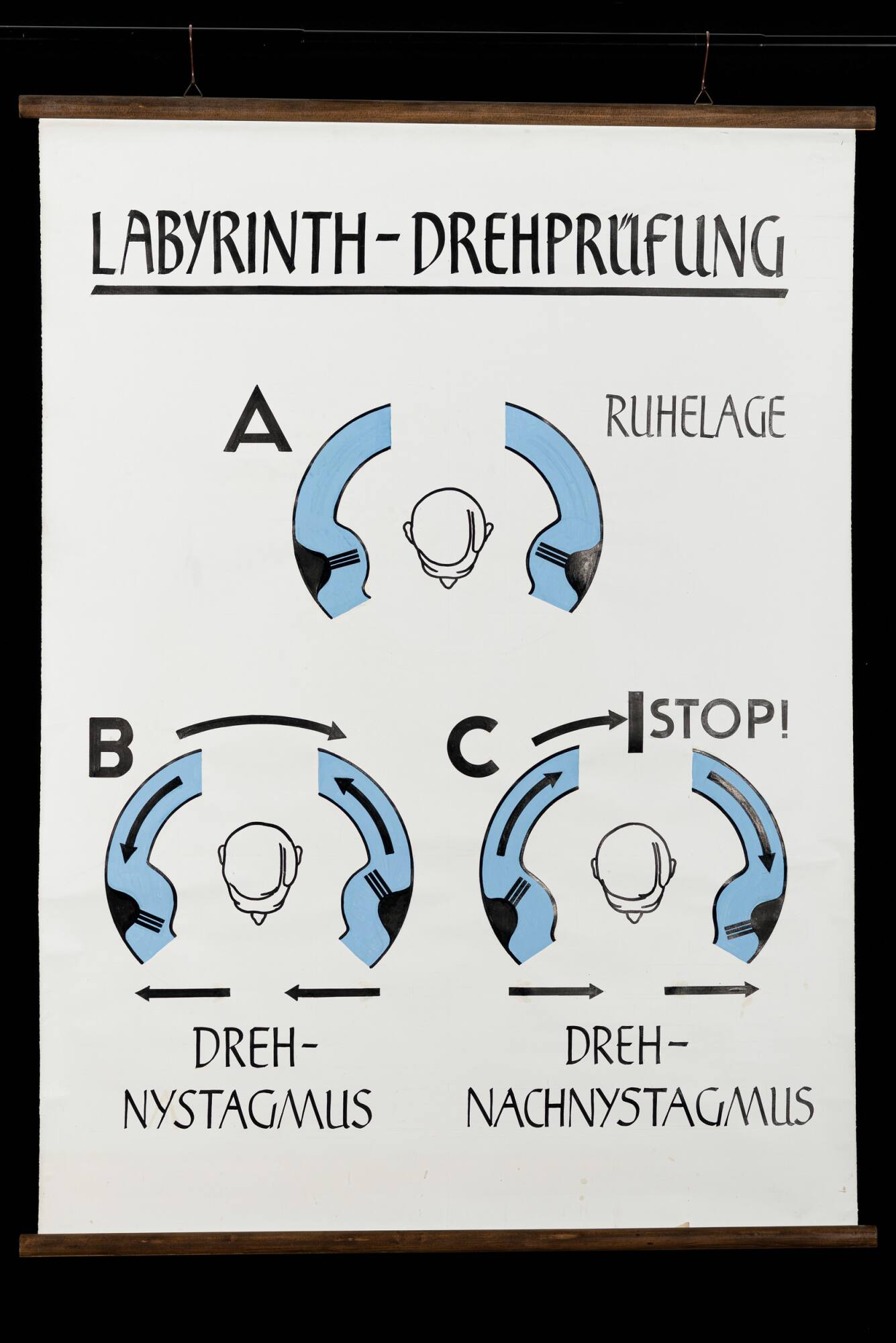 BeschreibungDas Gleichgewichtsorgan jeder Seite besteht unter anderem aus jeweils drei Bogengängen (Canales semicirculares ossei), deren Ebene zueinander senkrecht ist. Somit werden alle drei Raumdimensionen erfasst. Zur Prüfung der Funktion des seitlichen Bogengangs kann ein so genannter Dreh- oder Rotationsstuhl verwendet werden. Der Patient wird in aufrechter Sitzposition so platziert, dass die Bogengangsebene senkrecht zur Rotationsachse ist. In Ruhe bewegt sich die Flüssigkeit in den Bogengängen nicht (A). Beginnt man nun den Stuhl mit konstanter Winkelgeschwindigkeit zu rotieren, kommt es zur relativen Bewegung der Flüssigkeit zu den Haarsinneszellen in der Ampulle (B). Es stellt sich ein Drehnystagmus in Drehrichtung ein. Bei mit konstanter Geschwindigkeit fortgesetzter Rotation wird auch die Flüssigkeit im Bogengang beschleunigt, sodass es zu keiner Erregung der Haarsinneszellen mehr kommt. Stoppt man nun abrupt die Rotation, so kommt es durch die Massenträgheit der Flüssigkeit erneut zu einer Relativbewegung zwischen Bogengang und Flüssigkeit. Die Haarsinneszellen werden erneut erregt – es kommt zu einem postrotatorischen Nystagmus in entgegengesetzter Richtung (C).MaßeH x B: 140 × 100 cm