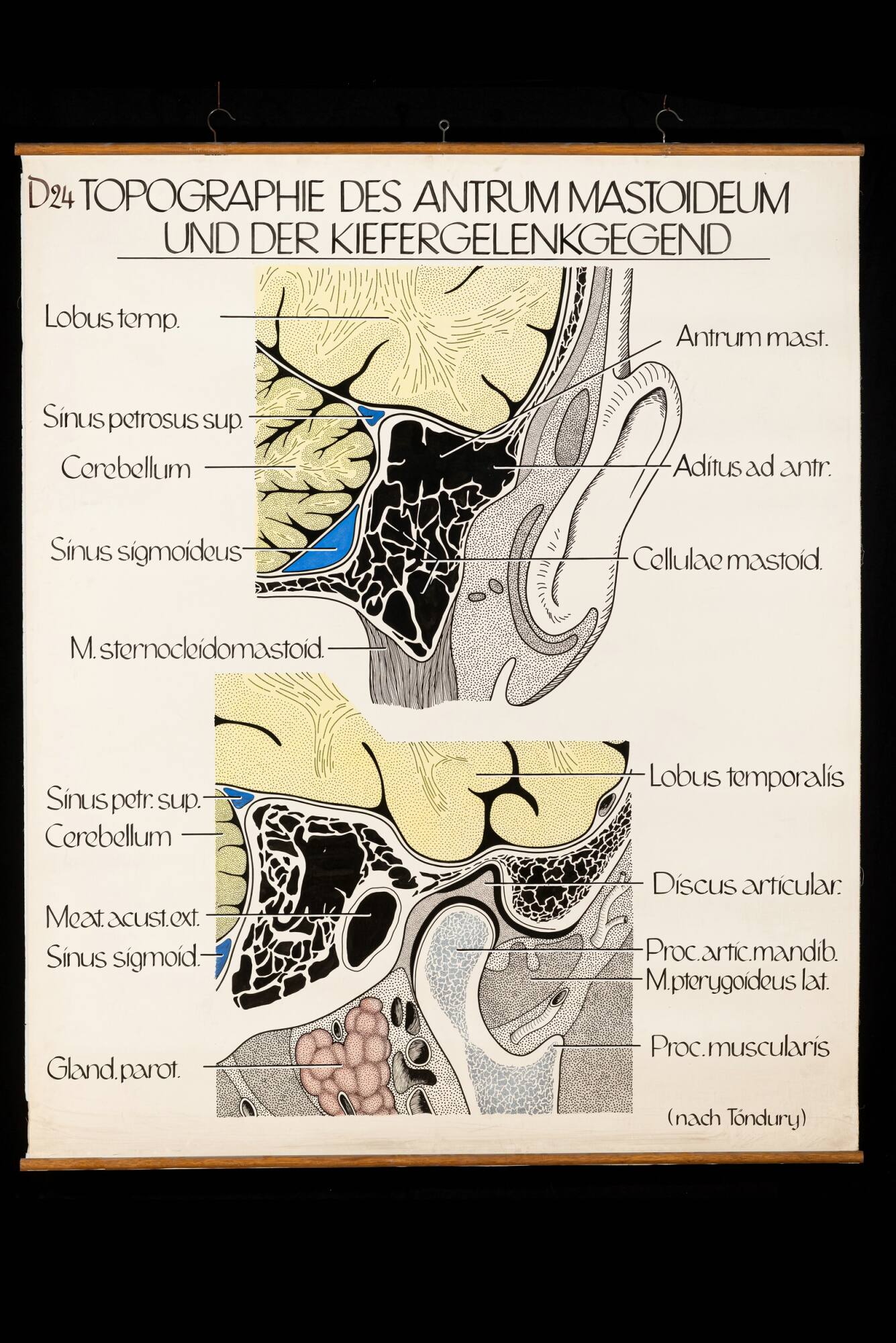 BeschreibungAuf dieser Tafel ist die Schnittbildanatomie des Schläfenbeins (Os temporale) in verschiedenen Ebenen dargestellt. Die Schnittebene in der oberen Teilabbildung befi ndet sich weiter in Richtung des Hinterhaupts in dem Bereich, in dem die Mittelohrräume in den Warzenfortsatz (Processus mastoideus) übergehen. Die lufthaltigen Bereiche sind schwarz dargestellt, die von knöchernen Trabekeln durchzogen sind. Unmittelbar am Warzenfortsatz entspringend ist der große Kopfwendemuskel (Musculus sternocleidomastoideus), welcher sich bis zum Schlüssel- und Brustbein zieht. Im Schädelinneren grenzen nach oben der Schläfenlappen (Lobus temporalis) des Großhirns und nach hinten das Kleinhirn (Cerebellum) an. Darüber hinaus sind venöse Blutleiter des Gehirns dargestellt (Sinus petrosus superior und Sinus sigmoideus). Die Schnittebene der unteren Teilabbildung liegt weiter in Richtung des Gesichts. Hier sind das rechte Kiefergelenk und Teile der rechten Ohrspeicheldrüse (Glandula parotis) angeschnitten.MaßeH x B: 184 × 150 cm