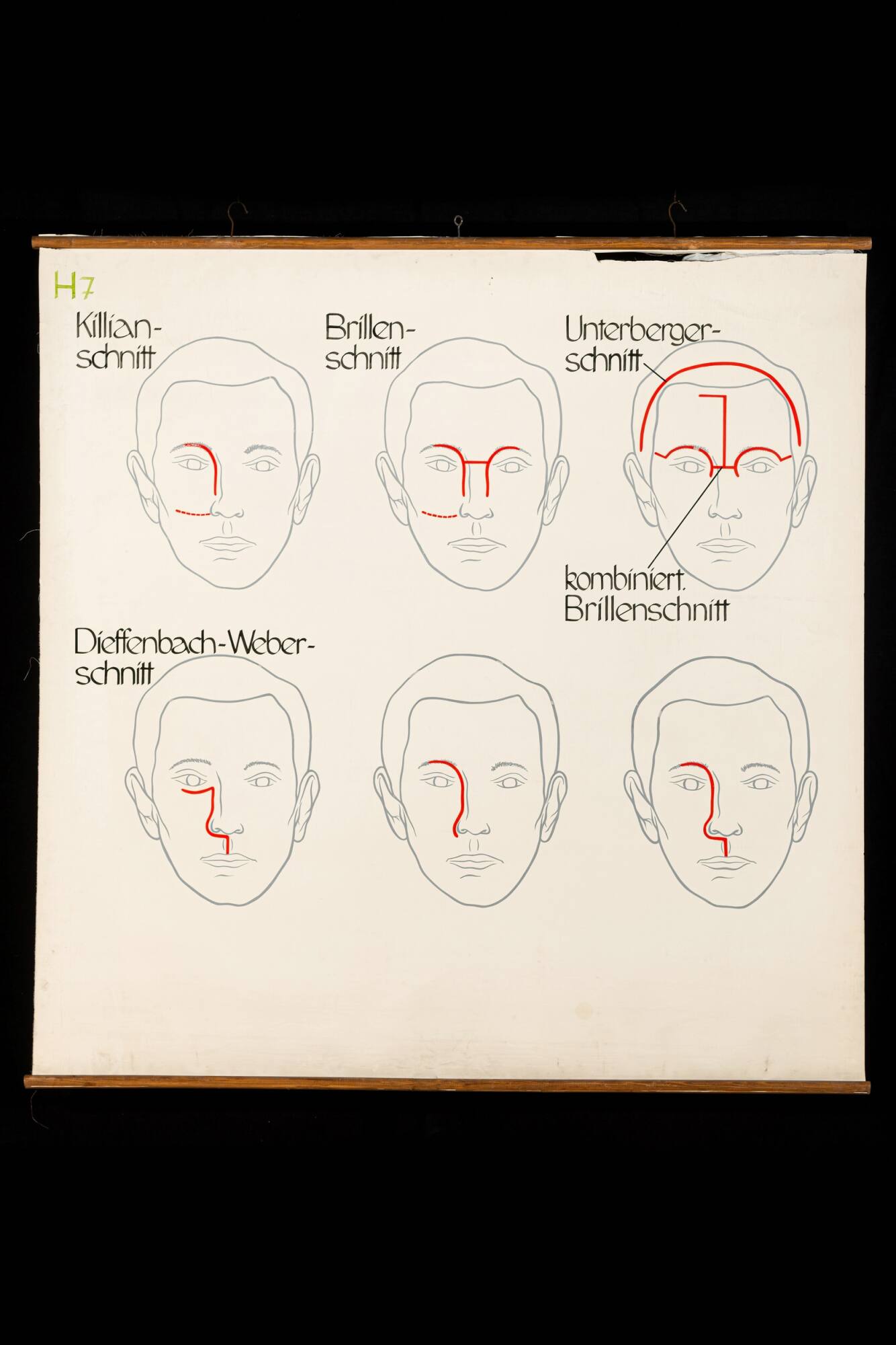 BeschreibungZur operativen Versorgung von Mittelgesichtsfrakturen können verschiedene Zugangswege und Schnittführungen gewählt werden. Beim Killianschnitt wird auf einer Seite unterhalb der Augenbraue und im Bogen entlang des Nasenrückens inzidiert. Der Brillenschnitt ist ein beidseitiger Killianschnitt, der durch einen horizontalen Schnitt über den Nasenrücken verbunden wird. Der Brillenschnitt kann in seiner Form variieren und auch mit einem Unterbergerschnitt (entlang des Haaransatzes) kombiniert werden. Beim Dieffenbach-Weber-Schnitt wird auf unterschiedliche Weisen entlang des Auges und um die Nase herum bis hin zur Oberlippe geschnitten.MaßeH x B: 154 × 150 cm