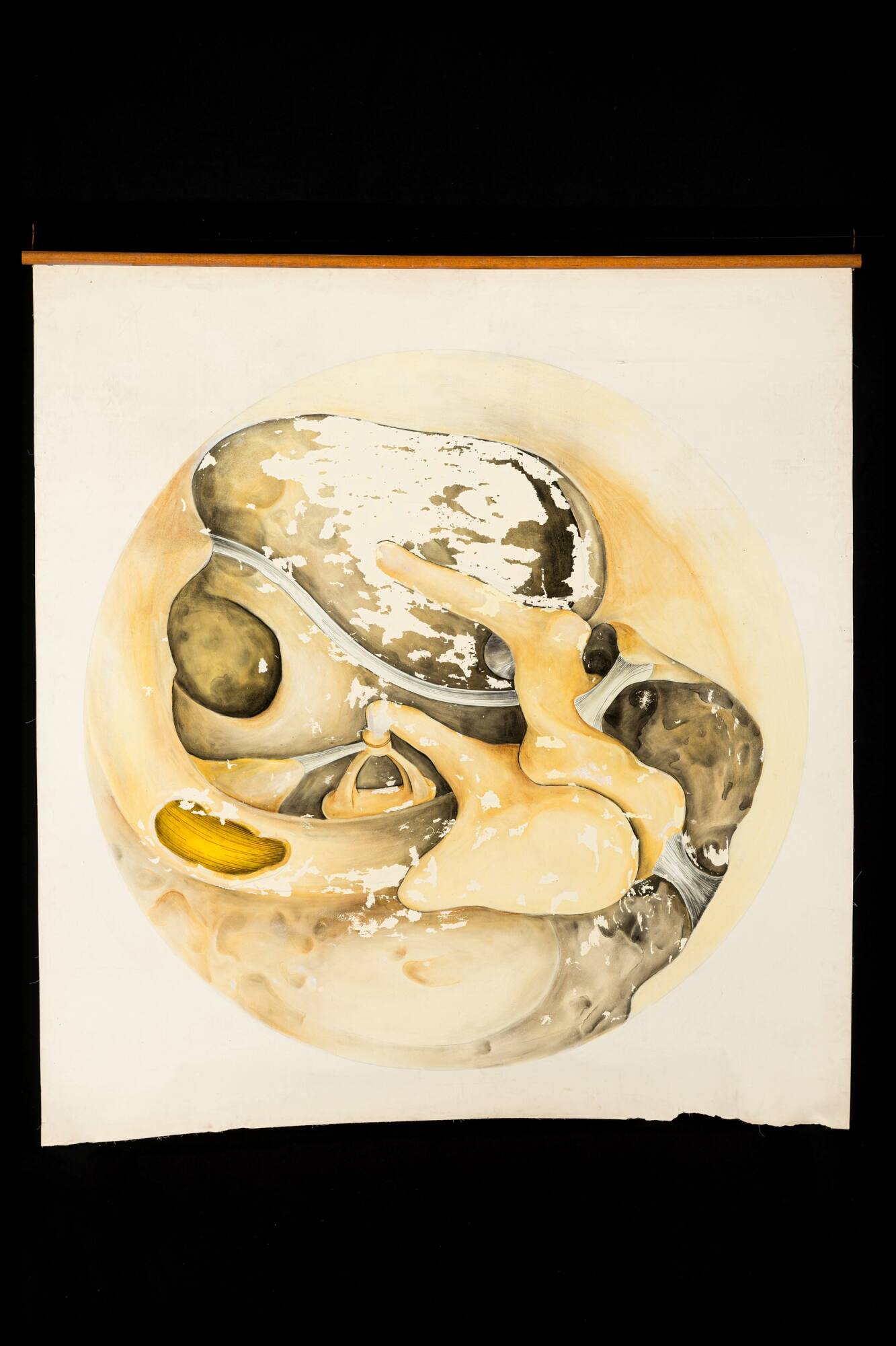 BeschreibungZu sehen ist die Lage der Gehörknöchelchen in einem linken Mittelohr zueinander und deren Fixierung mit Bändern (Ligamenten) sowie die Sehnen der zwei sich im Bereich des Mittelohres befindlichen Muskeln. Der knöcherne Gehörgang wurde nach hinten erweitert und der knöcherne Kanal des Gesichtsnervs (Nervus facialis) eröffnet.MaßeH x B: 150 × 143 cm