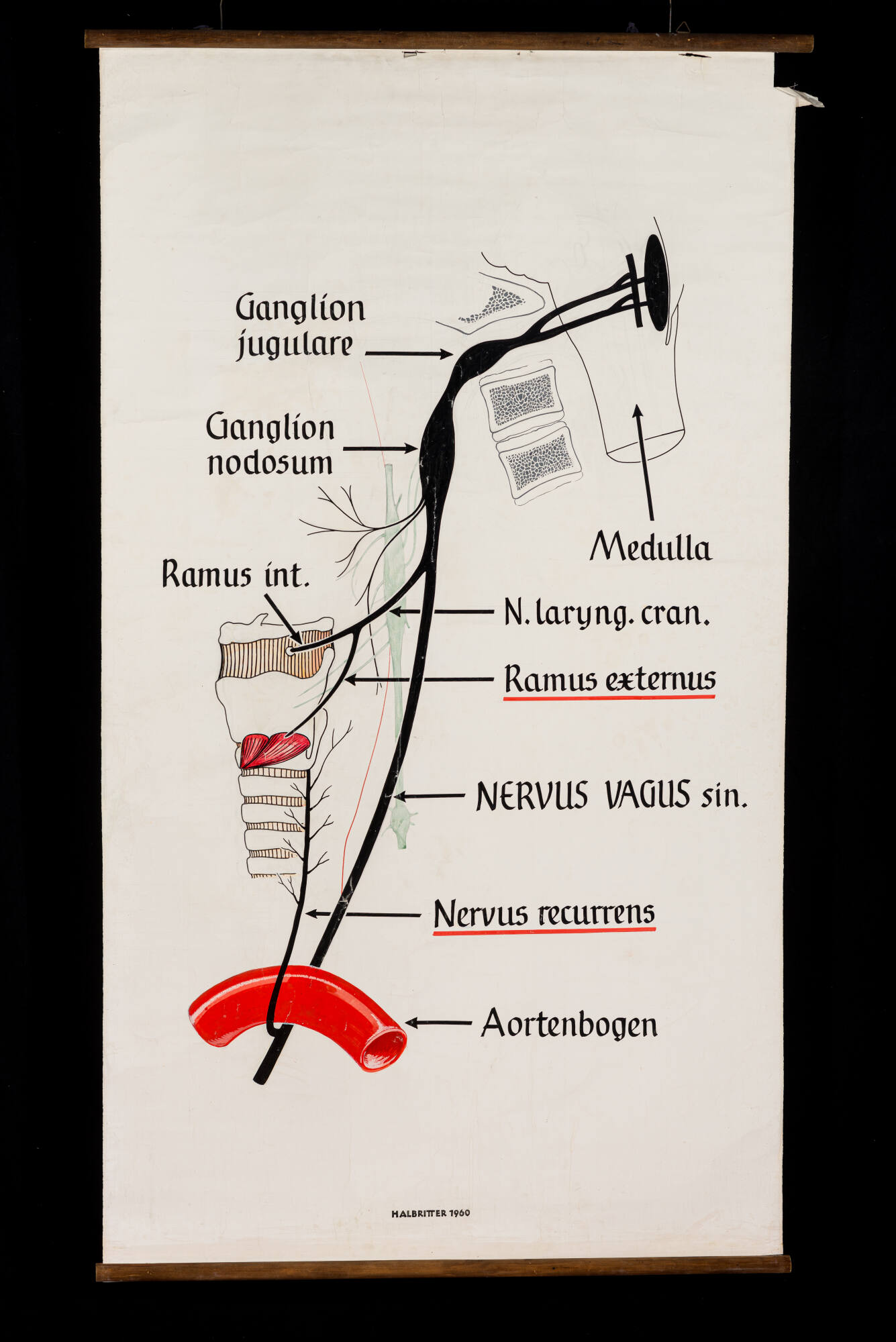 BeschreibungSchematische Darstellung des Verlaufs des linken Nervus Vagus (X. Hirnnerv), der auf Höhe der Medulla oblongata an die Hirnoberfläche tritt und durch das Foramen jugulare den Gehirnschädel verlässt. Der Fokus der Abbildung liegt auf den beiden für die Innervation des Kehlkopfes relevanten Nervenabgängen: Nervus laryngeus superior (cranialis) und Nervus laryngeus recurrens. Der Nervus laryngeus superior teilt sich in einen rein motorischen Ramus externus, der den Musculus cricothyroideus innerviert, und einen sensiblen Ramus internus, der durch die Membrana thyrohyoidea in das Kehlkopfinnere zieht und die Schleimhautsensibilität oberhalb der Glottis gewährleistet. Der Nervus laryngeus recurrens innerviert die Schleimhaut unterhalb der Glottis sensibel sowie sämtliche Binnenmuskeln des Kehlkopfes motorisch.MaßeH x B: 180 × 101 cm