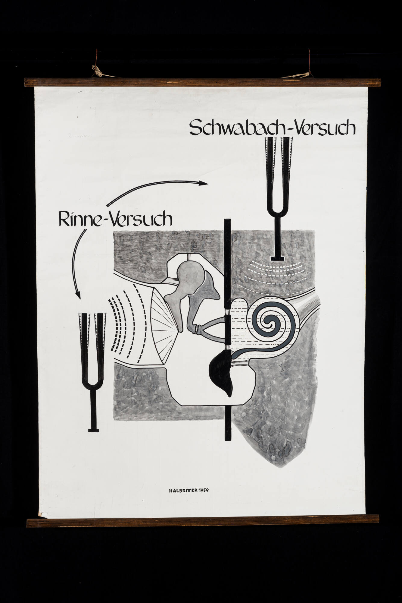 BeschreibungStimmgabelprüfungen bilden noch heute einen integralen Bestandteil der HNO-ärztlichen Untersuchung. Sie dienen zur orientierenden Hörprüfung. Beim Schwabach-Versuch (Dagobert Schwabach, 1846–1920, deutscher Otologe) wird die klingende Stimmgabel auf den Warzenfortsatz des Patienten gesetzt. Dieser signalisiert, wenn er den Ton auf dem geprüften Ohr nicht mehr hört. Nun wird die noch klingende Stimmgabel entweder auf den gegenseitigen Warzenfortsatz oder den des Untersuchers gesetzt. Somit kann eine Einschätzung der Schwerhörigkeit erfolgen. Beim Rinne-Versuch (Heinrich Adolf Rinne, 1819–1868, deutscher Otologe) wird die klingende Stimmgabel auf den Warzenfortsatz des zu prüfenden Ohres gesetzt. Der Patient signalisiert dem Untersucher, wenn der den Ton auf dem Ohr nicht mehr hört. Nun hält der Untersucher die noch klingende Stimmgabel ohne neuerliches Anschlagen vor das untersuchte Ohr. Hört der Patient den Ton wieder, spricht dies für eine normale Schallweiterleitung im Gehörgang und Mittelohr („Rinne positiv“). Wird der Ton nicht wieder gehört („Rinne negativ“) legt dies eine Schallleitungsschwerhörigkeit nahe.MaßeH x B: 137 × 100 cm