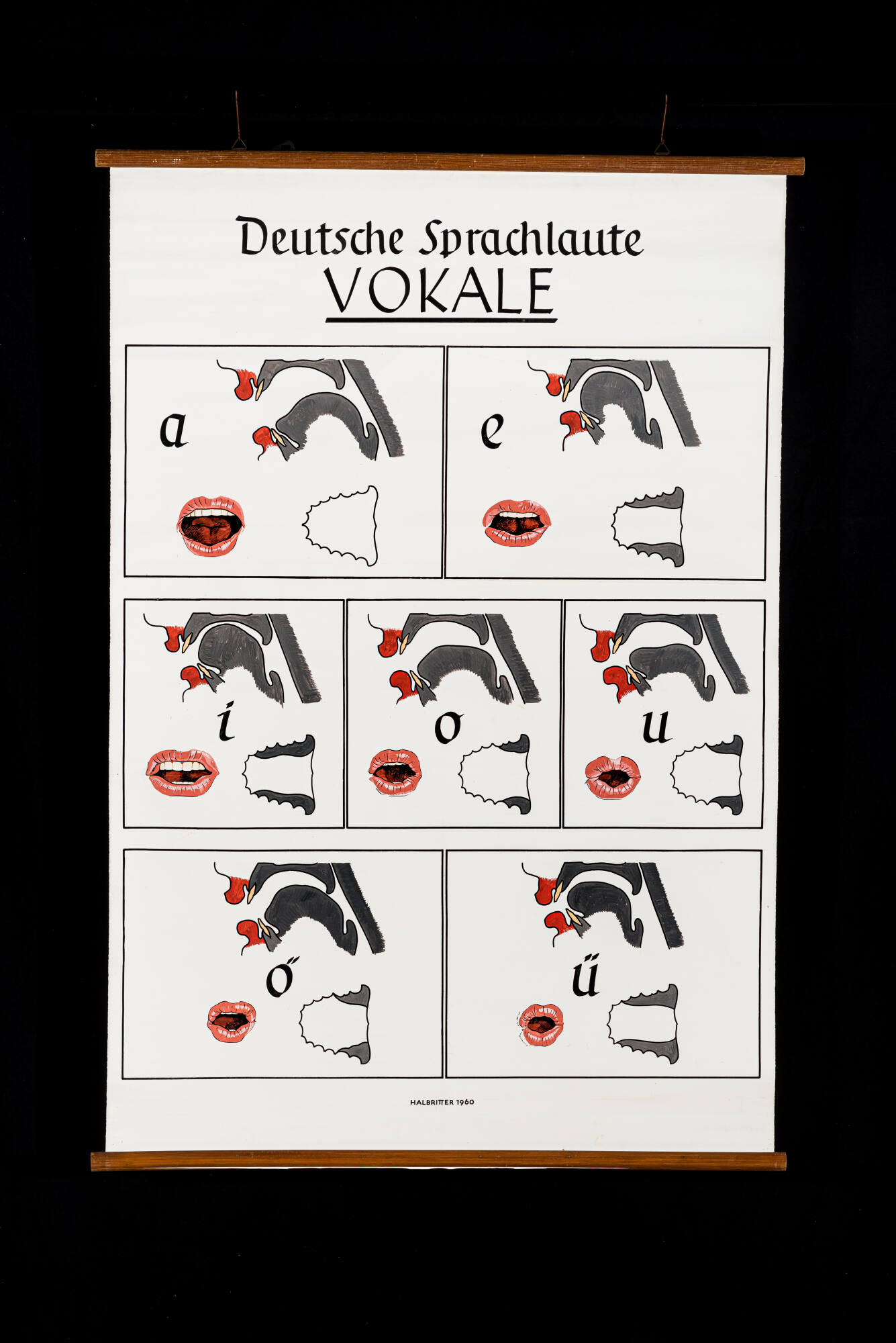 BeschreibungZur Bildung von Wörtern und Sprache arbeiten verschiedene Bereiche des Stimmapparates zusammen. Von den Stimmlippen über die Zunge und die Lippen sind spezielle Abläufe entscheidend für die Art der Laute. Vokale sind stimmhaft, und das erzeugte Signal kann als Klang bezeichnet werden. Bei der Bildung von Vokalen im Ansatzrohr liegt anders als bei den Konsonanten keine Einengung oder Blockade des Luftstroms vor. Die Differenzierung der unterschiedlichen Vokale erfolgt durch Veränderung der Zungenstellung und der Position der Lippen wie hier abgebildet.MaßeH x B: 150 × 100 cm