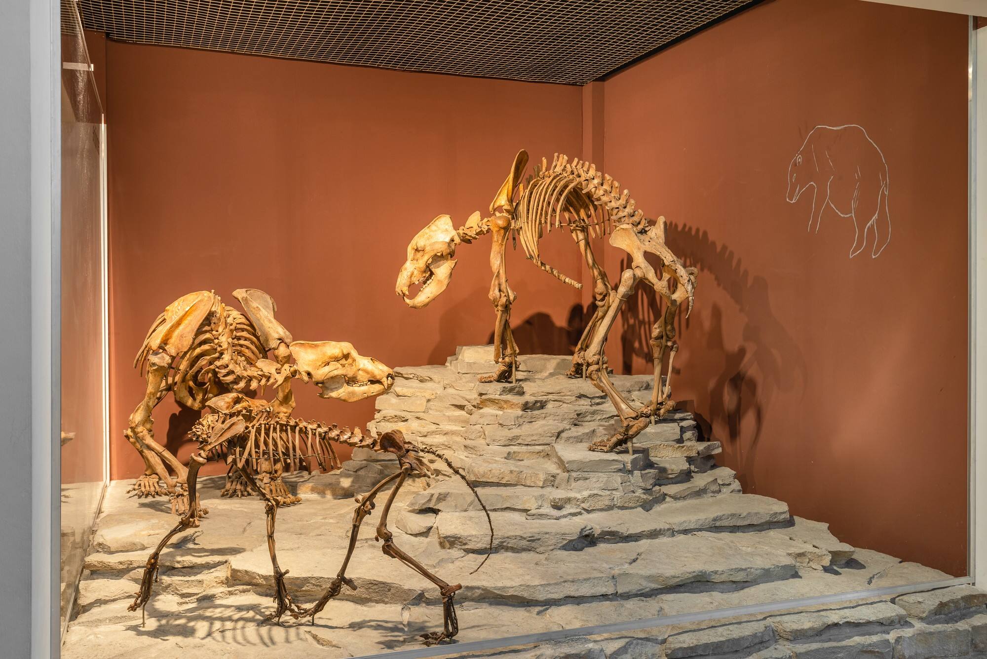 BeschreibungUrsus spelaeus (ROSENMÜLLER 1794) (Mammalia, Carnivora, Ursidae); Pleistozän, 400 000 bis etwa 28 000 Jahre; Höhlen bei Erpfingen, Landkreis Reutlingen, Baden-Württemberg; 1838 erster Zugang unter Friedrich August Quenstedt in die Sammlung und 1949 weitere Funde unter Richard Dehm, montiert durch Friedrich von Huene und Friedrich Kern 1952; Inv.-Nr. GPIT-PV-30084 und -30085 (syn. einzelner Knochen u.a. PV 278–283 und PV 24366).Objektnr.GEO-Ps-GPIT-PV-30084