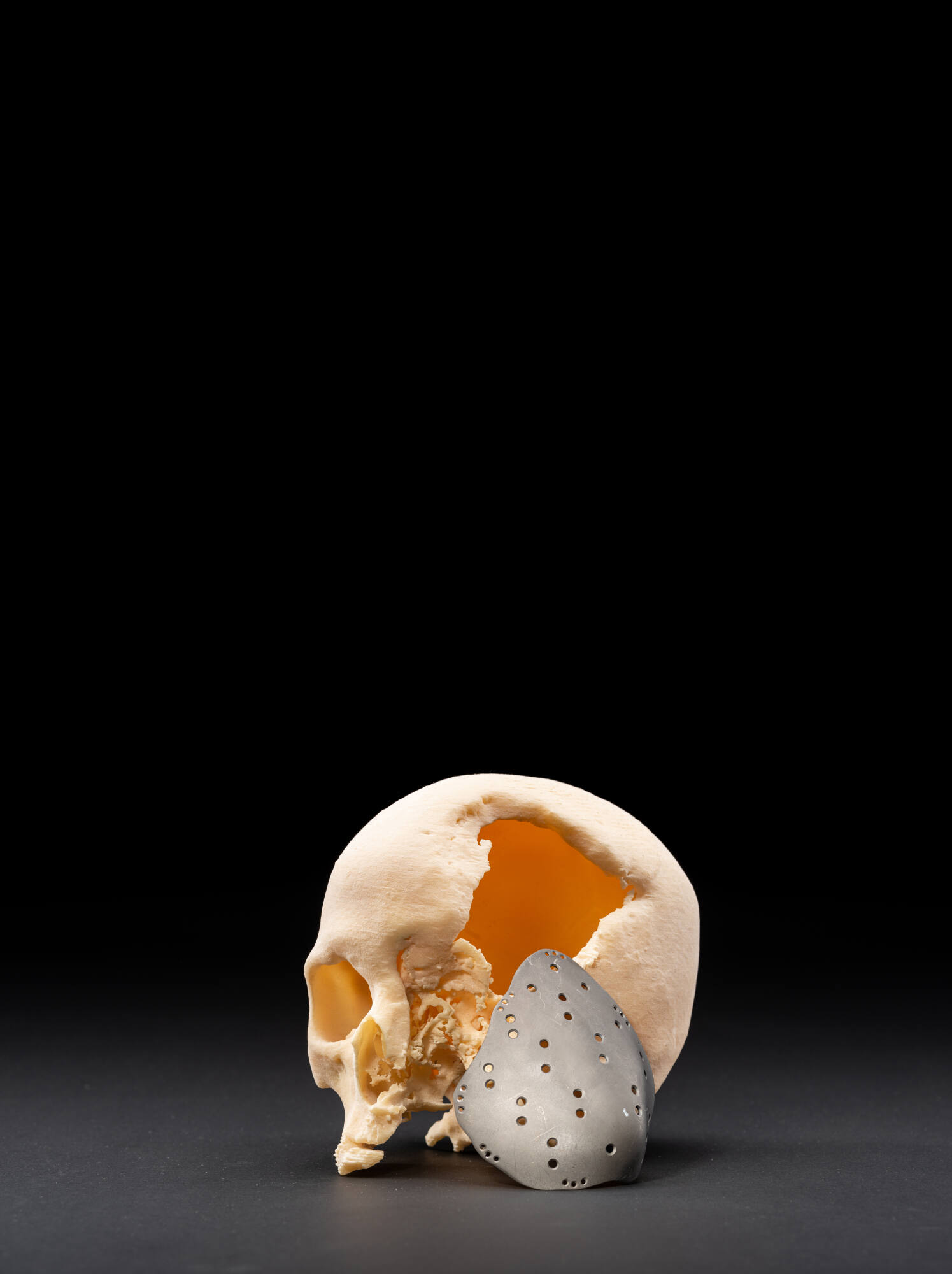 BeschreibungDieses Titan-Implantat wurde zur Abdeckung eines Defekts an der Schädeldecke, auch Schädelkalotte genannt, produziert. Es wurde mithilfe eines reduktiven Verfahrens, also durch Materialabtrag mithilfe von Fräsen aus einem Metallblock hergestellt. Die Defektzone war nach der Resektion eines Osteosarkoms, der Entfernung eines Knochentumors, entstanden. Nach mehrfachem Wiederauftreten und Widerentfernen des Tumors wurde der Gewebeschaden mittels einer Transplantation von Weichgewebe aus dem Oberschenkel abgedeckt. Geplant war zudem die Rekonstruktion des Knochens durch das abgebildete Titan-Implantat, worauf schließlich jedoch verzichtet wurde. Das Schädelmodell wurde auf Basis eines CT-Datensatzes mittels Stereolithografie in Originalgröße gedruckt und besteht aus einem Polymer Werkstoff. Die exakte Wiedergabe der Defektzone garantiert eine passgenaue Anfertigung des Implantats.MaßeH x B x T (Implantat): 10 × 9 × 3 cm