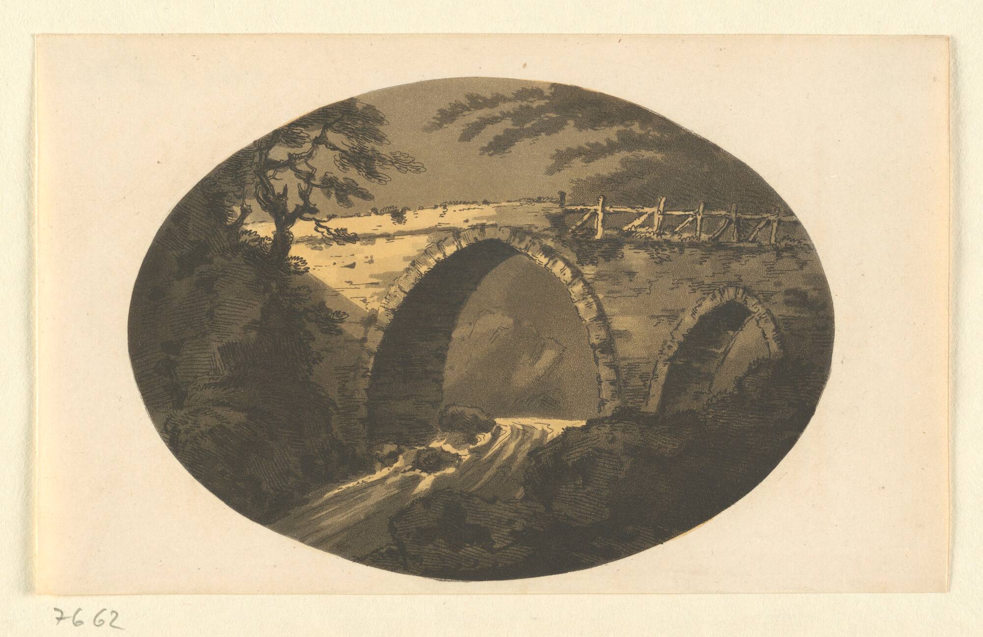 BeschreibungLandschaftsdarstellung in ovaler Bildform: Steinbrücke über Fluss, seitlich Bäume.MaßeH x B (Blattgrund): 132 × 215 mm