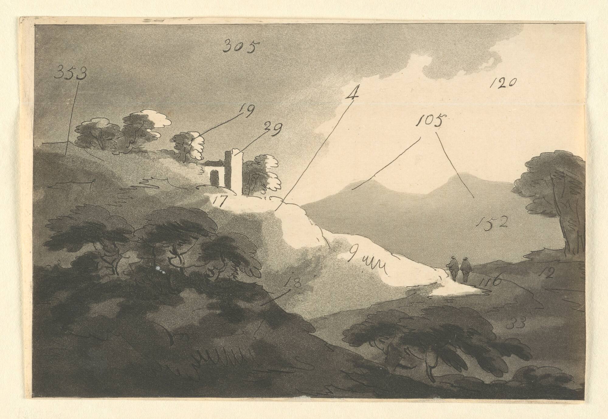 BeschreibungLandschaftsdarstellung, Studienzeichnung mit nummerischer Kennzeichnungen der Farbtöne.MaßeH x B (Blatt): 145 × 211 mm