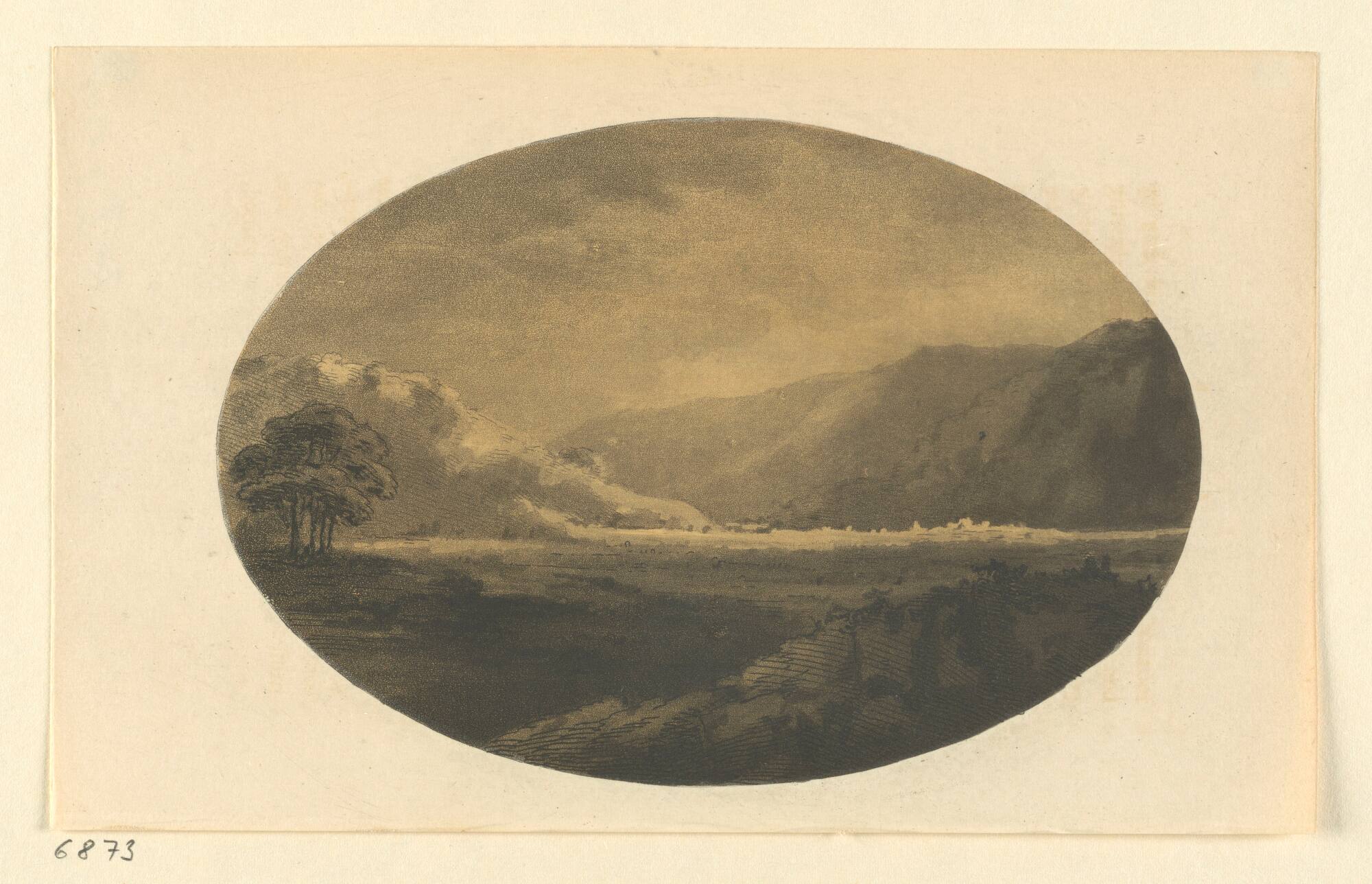 BeschreibungLandschaftsdarstellung in ovaler Bildform: EIne Wiese mit einem Baum auf der linken Seite, im Hintergrund sind Gebirszüge zu erkennen.MaßeH x B (Blattgrund): 133 × 214,5 mm