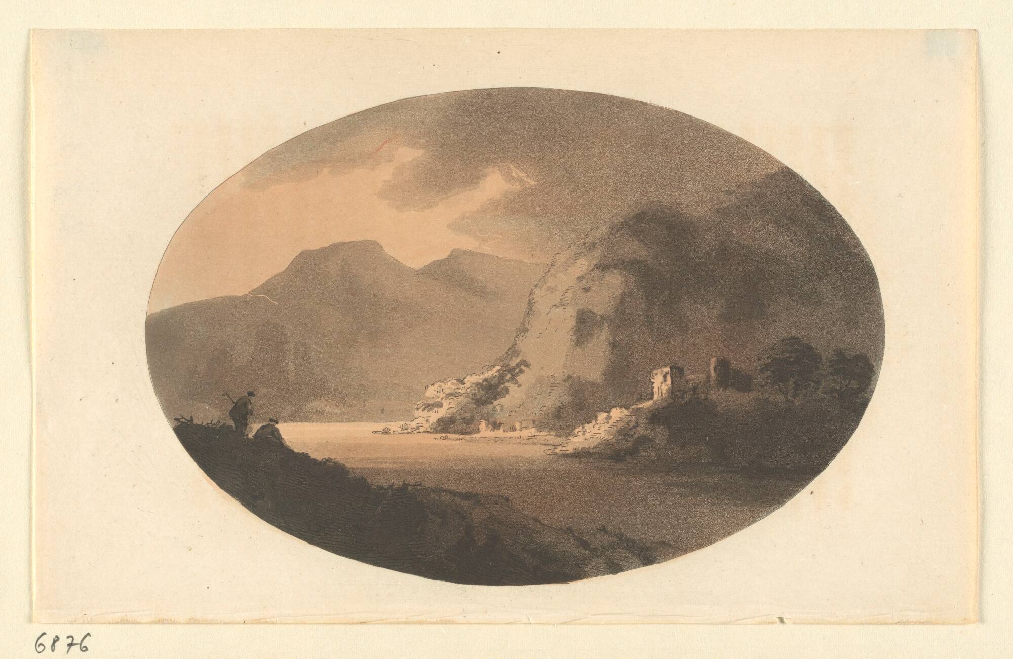 BeschreibungLandschaftsdarstellung in ovaler Bildform: Fluss und Gebirgszüge.MaßeH x B (Blatt): 135 × 215 mm