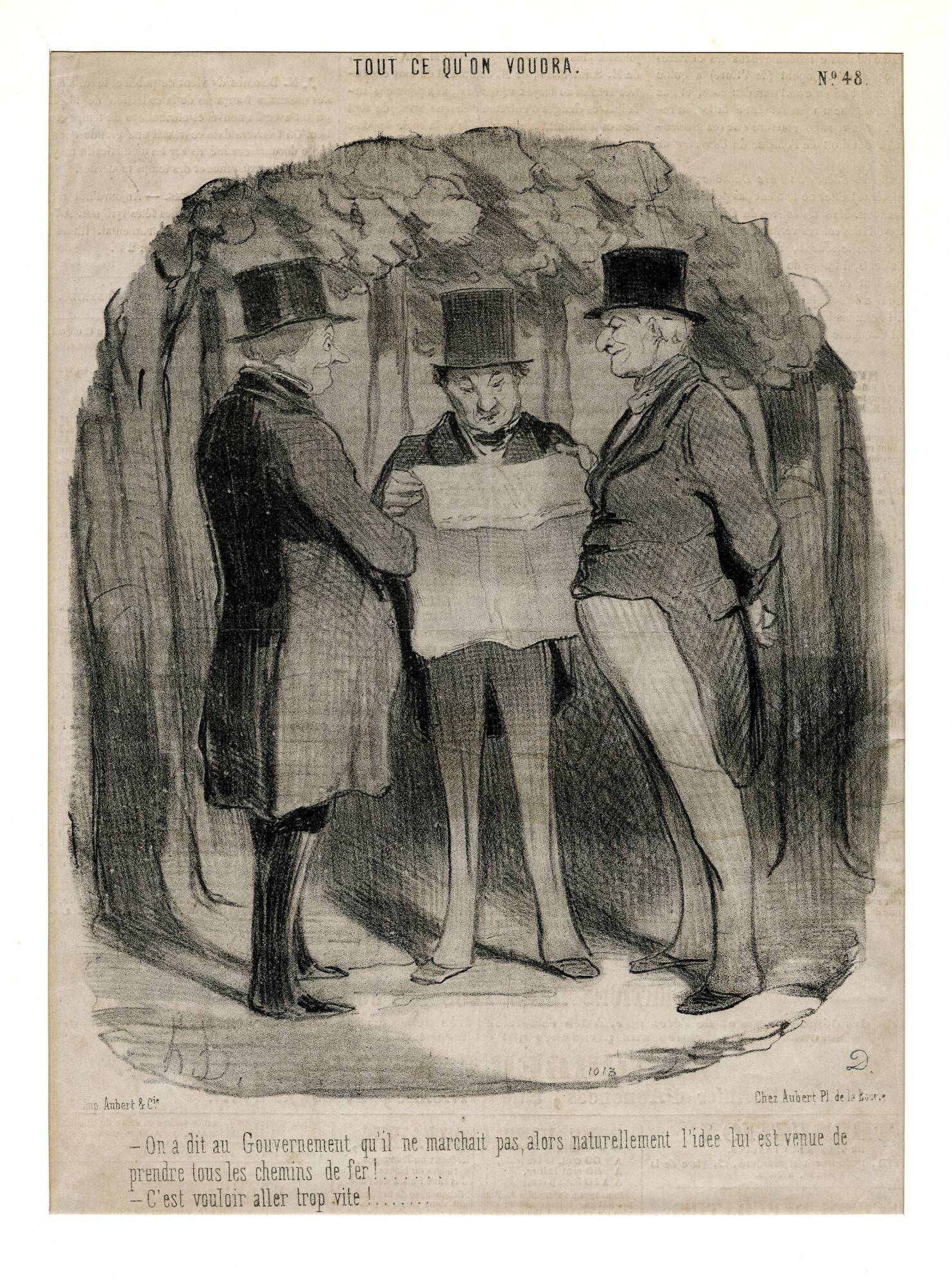 -On a dit au Gouvernement qu'il ne marchait pas, alors naturellement l'idée lui est venue de prendre tous les chemins de fer!....../-C'est vouloir aller trop vite!.......