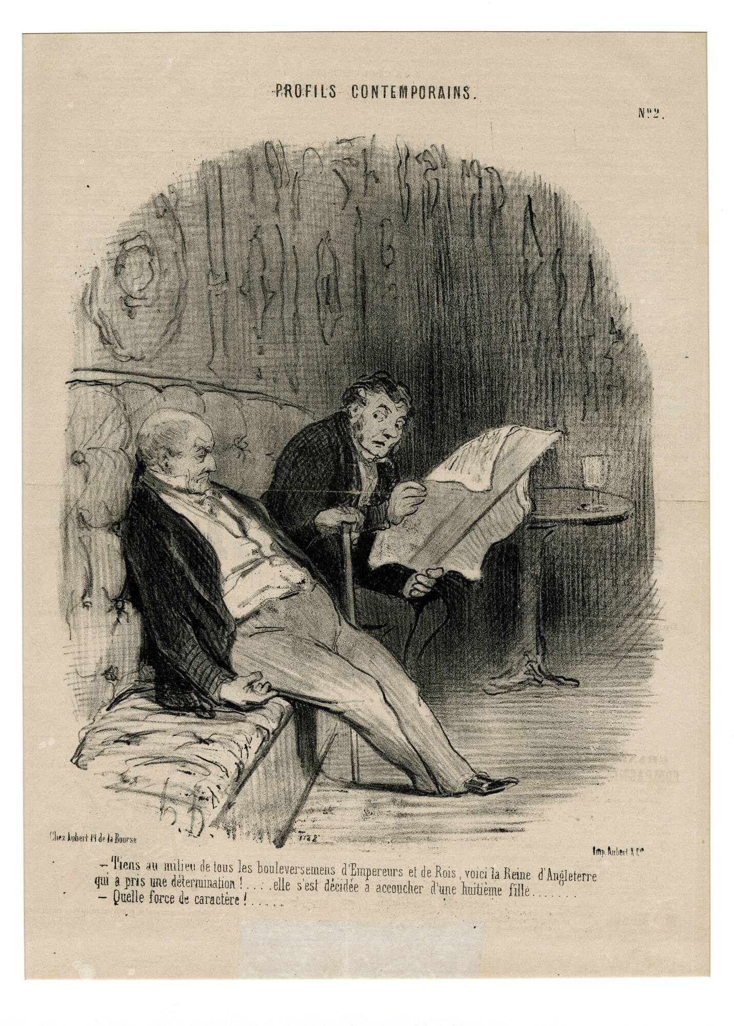 - Tiens au milieu de tous les bouleversemens d'Empereurs et de Rois, voici la Reine d'Angleterre qui a pris une détermination!.... elle s'est décidée à accoucher d'une huitième fille......./ - Quelle force de caractère!.....