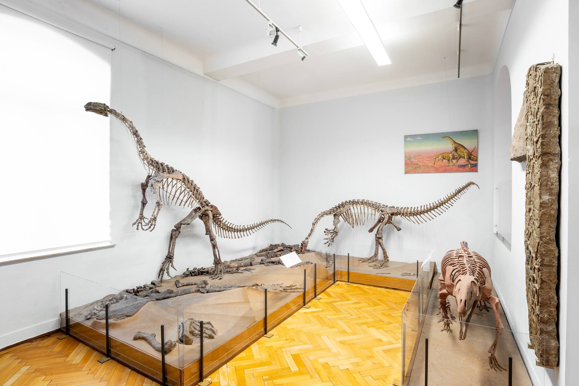 BeschreibungPlateosaurus engelhardti (von Meyer 1837) (Reptilia, Dinosauria, Sauropodomorpha); Trias, Keuper, Trossingen-Formation, 206 Millionen Jahre; Obere Mühle bei Trossingen, Landkreis Tuttlingen, Baden-Württemberg; 1921 bis 1923 deutsch-amerikanische Kooperation, finanziert vom American Museum of Natural History, New York, ausgegraben und montiert durch Friedrich von Huene, Georg und Wilhelm Wetzel; Inv.-Nr. GPIT-PV-30784 (syn. GPIT/RE/9386) und GPIT-PV-30785 (syn. GPIT/RE/7288).