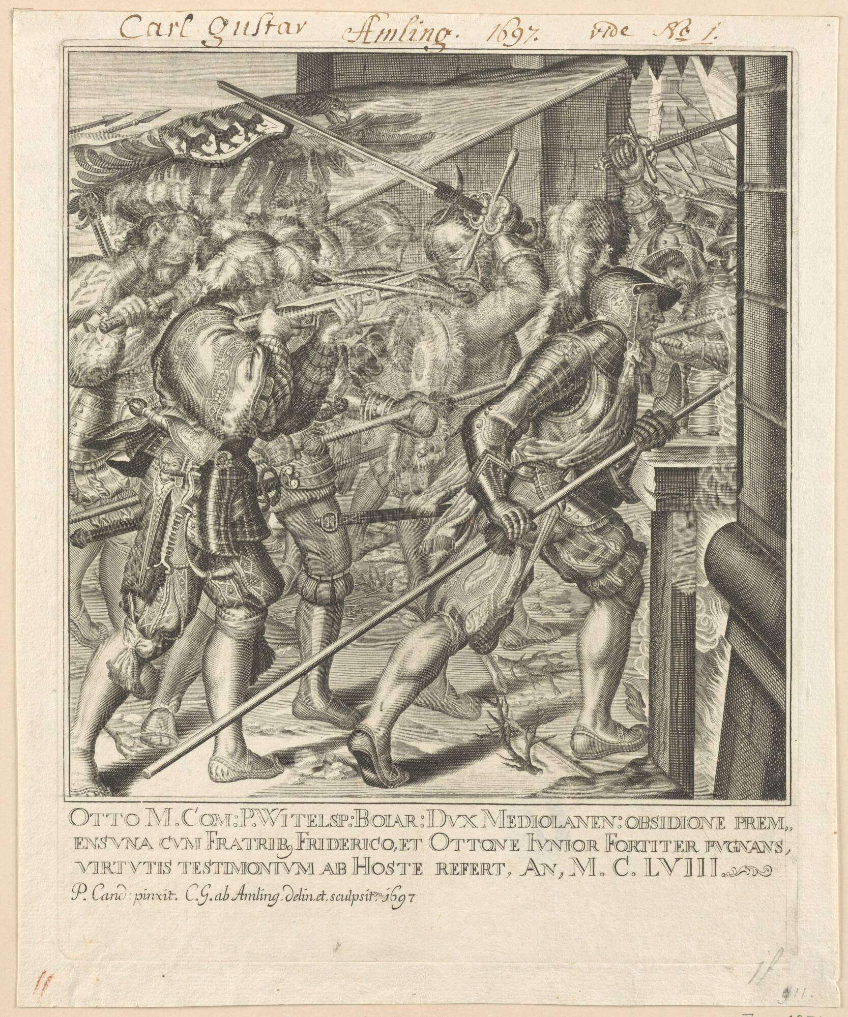 OTTO M. COM: P. WITELSP: BOIAR: DVX MEDIOLANEN: OBSIDIONE PREM,, / ENSVNA CVM FRATRIBg FRIDERICO, ET OTTONE IVNIOR FORTITER PVGNANS, / VIRTVTIS TESTIMONIVM AB HOSTE REFERT, AN, M. C. LVIII.