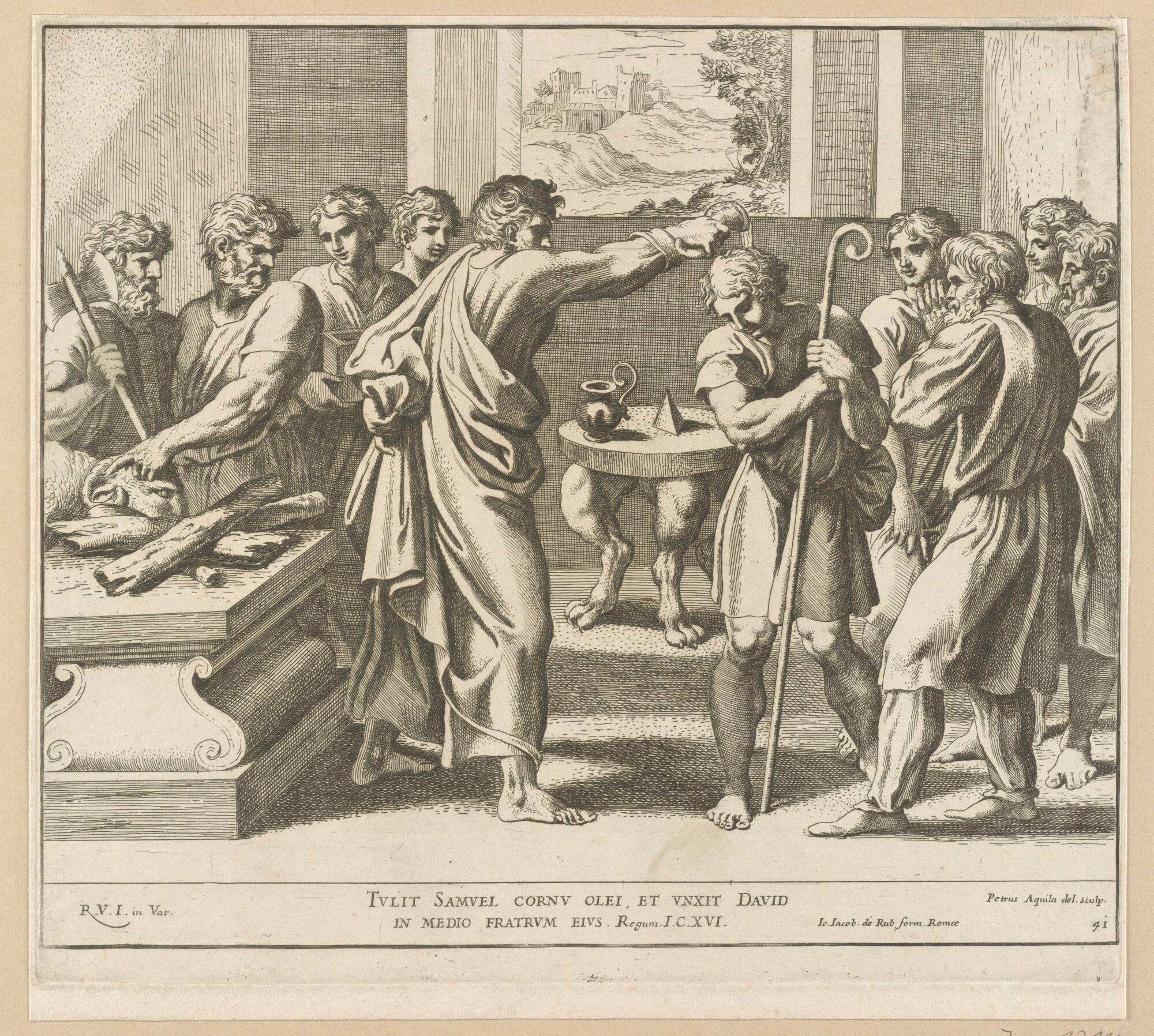 TVLIT SAMVEL CORNV OLEI, ET VNXIT DAVID / IN MEDIO FRATRVM EIVS. Regum. I.C.XVI.