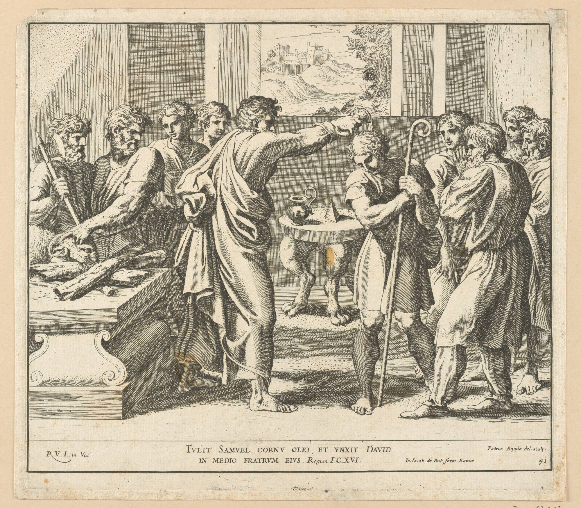 TVLIT SAMVEL CORNV OLEI, ET VNXIT DAVID / IN MEDIO FRATRVM EIVS. Regum. I.C.XVI.